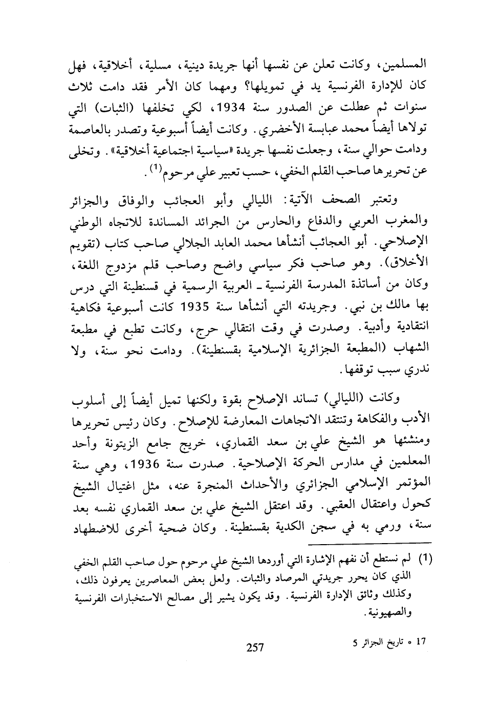 (¬1) لم نستطع أن نفهم الإشارة التي أوردها الشيخ علي مرحوم حول صاحب القلم الخفي الذي كان يحرر جريدتي المرصاد والثبات. ولعل بعض المعاصرين يعرفون ذلك، وكذلك وثائق الإدارة الفرنسية. وقد يكون يشير إلى مصالح الاستخبارات الفرنسية والصهيونية.