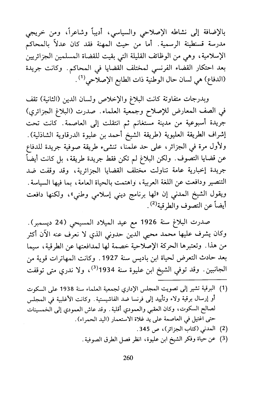 وبدرجات متفاوتة كانت البلاغ والإخلاص ولسان الدين (الثانية) تقف في الصف المعارض للإصلاح وجمعية العلماء. صدرت (البلاغ الجزائري) جريدة أسبوعية من مدينة مستغانم ثم انتقلت إلى العاصمة. كانت تحت إشراف الطريقة العليوية (طريقة الشيخ أحمد بن عليوة الدرقاوية الشاذلية). ولأول مرة في الجزائر، على حد علما، تنشئ طريقة صوفية جريدة للدفاع عن قضايا التصوف. ولكن البلاغ لم تكن فقط جريدة طريقة، بل كانت أيضا جريدة إخبارية عامة تناولت مختلف القضايا الجزائرية، وقد وقفت ضد التنصير ودافعت عن اللغة العربية، واهتمت بالحياة العامة، بما فيها السياسة. ويقول الشيخ المدني إن (لها برنامج ديني إسلامي وطني)، ولكنها دافعت أيضا. عن التصوف والطرقية (¬2).
