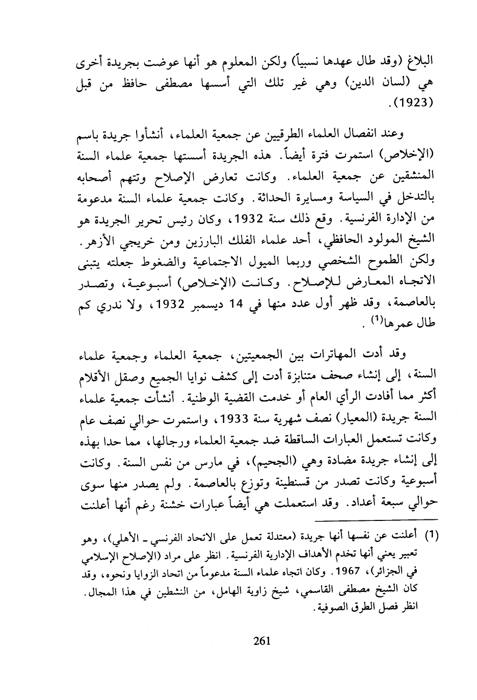 (¬1) أعلنت عن نفسها أنها جريدة (معتدلة تعمل على الاتحاد الفرنسي - الأهلي)، وهو تعبير يعني أنها تخدم الأهداف الإدارية الفرنسية. انظر على مراد (الإصلاح الإسلامي في الجزائر)، 1967. وكان اتجاه علماء السنة مدعوما من اتحاد الزوايا ونحوه، وقد كان الشيخ مصطفى القاسمي، شيخ زاوية الهامل، من النشطين في هذا المجال. انظر فصل الطرق الصوفية.