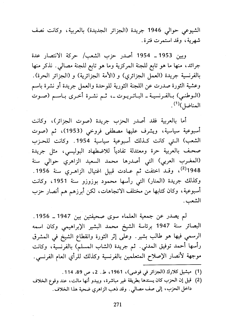 أما بالعربية فقد أصدر الحزب جريدة (صوت الجزائر)، وكانت أسبوعية سياسية، ويشرف عليها مصطفى فروخي (1953)، ثم (صوت الشعب) التي كانت كذلك أسبوعية سياسية 1954. وكانت للحزب صحف بالعربية حرة ومعتدلة تفاديا للاضطهاد البوليسي، مثل جريدة (المغرب العربي) التي أصدرها محمد السعيد الزاهري حوالي سنة 1948 (¬2)، وقد اختفت ثم عادت قبيل اغتيال الزاهري سنة 1956. وكذلك جريدة (المنار) التي رأسها محمود بوزوزو سنة 1951، وكانت أسبوعية، وكان كتابها من مختلف الاتجاهات، لكن أبرزهم هم أنصار حزب الشعب.