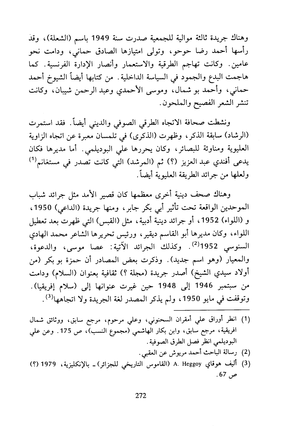 ونشطت صحافة الاتجاه الطرقي الصوفي والديني أيضا. فقد استمرت (الرشاد) سابقة الذكر، وظهرت (الذكرى) في تلمسان معبرة عن اتجاه الزاوية العليوية ومناوئة للبصائر، وكان يحررها علي البوديلمي. أما مديرها فكان يدعى أفندي عبد العزيز (؟) ثم (المرشد) التي كانت تصدر في مستغانم (¬1) ولعلها من جرائد الطريقة العلوية أيضا.