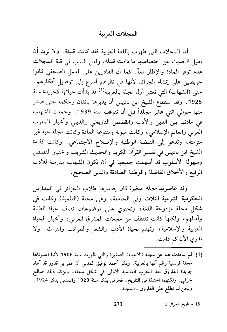 أما المجلات التي ظهرت باللغة العربية فقد كانت قليلة. ولا نريد أن نطيل الحديث عن اختصاصها ما دامت قليلة. ولعل السبب في قلة المجلات عدم توفر المادة والإطار معا. كما أن القادرين على العمل الصحفي كانوا حريصين على إنشاء الجرائد لأنها في نظرهم أسرع إلى توصيل أفكارهم. حتى (الشهاب) التي تعتبر أول مجلة بالعربية (¬1) قد بدأت حياتها كجريدة سنة 1925. وقد استطاع الشيخ ابن باديس أن يديرها باتقان وحكمة حتى صدر منها حوالي اثني عشر مجلدا قبل أن تتوقف سنة 1939. وجمعت الشهاب في مادتها بين الدين والأدب والقصص التاريخي والديني وأخبار المغرب العربي والعالم الإسلامي، وكانت مبوبة ومتنوعة المادة وكانت مجلة حية غير متزمتة، وتدعو إلى النهضة الوطنية والإصلاح الاجتماعي. وكانت كفاءة الشيخ ابن باديس في تفسير القرآن الكريم والحديث الشريف واختيار القصص وسهولة الأسلوب قد أسهمت جميعها في أن تكون الشهاب مدرسة للأدب الرفيع والأخلاق الفاضلة والوطنية الصادقة والدين الصحيح.