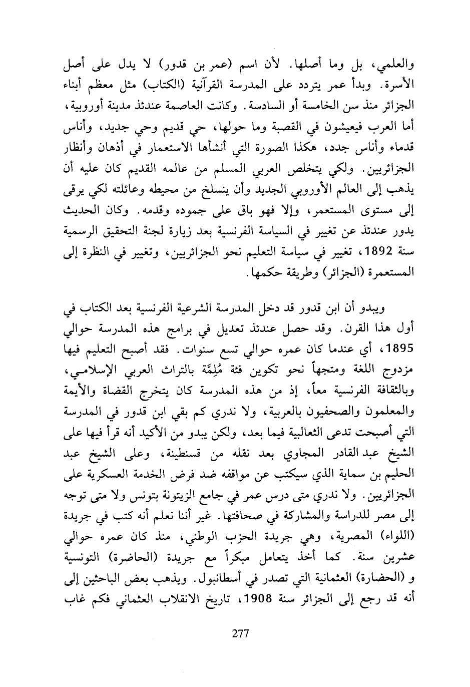 والعلمي، بل وما أصلها. لأن اسم (عمر بن قدور) لا يدل على أصل الأسرة. وبدأ عمر يتردد على المدرسة القرآنية (الكتاب) مثل معظم أبناء الجزائر منذ سن الخامسة أو السادسة. وكانت العاصمة عندئذ مدينة أوروبية، أما العرب فيعيشون في القصبة وما حولها، حي قديم وحي جديد، وأناس قدماء وأناس جدد، هكذا الصورة التي أنشأها الاستعمار في أذهان وأنظار الجزائريين. ولكي يتخلص العربي المسلم من عالمه القديم كان عليه أن يذهب إلى العالم الأوروبي الجديد وأن ينسلخ من محيطه وعائلته لكي يرقى إلى مستوى المستعمر، وإلا فهو باق على جموده وقدمه. وكان الحديث يدور عندئذ عن تغيير في السياسة الفرنسية بعد زيارة لجنة التحقيق الرسمية سنة 1892، تغيير في سياسة التعليم نحو الجزائريين، وتغيير في النظرة إلى المستعمرة (الجزائر) وطريقة حكمها.