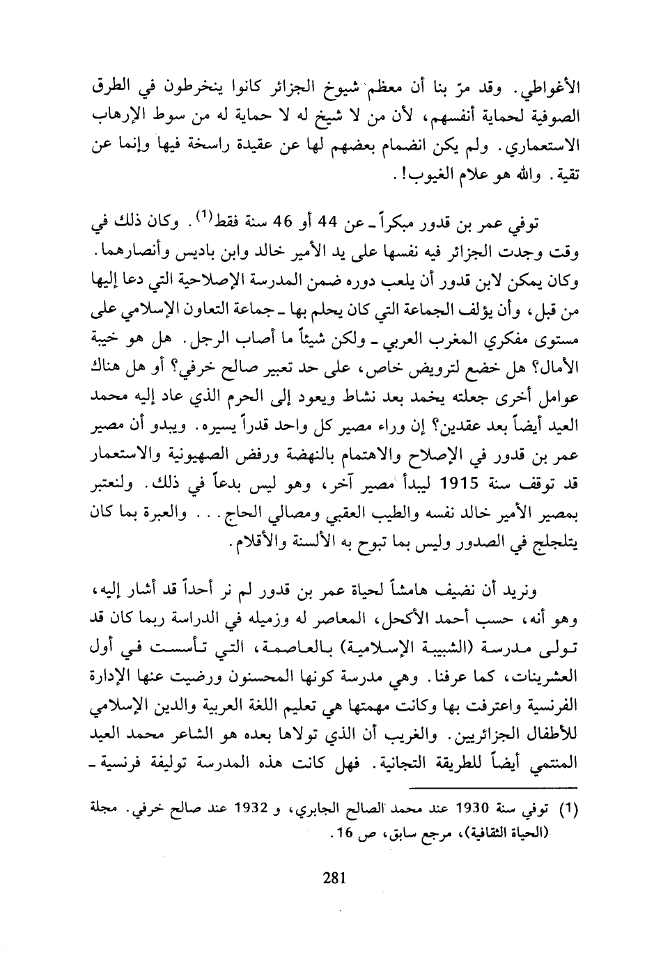 توفي عمر بن قدور مبكرا- عن 44 أو 46 سنة فقط (¬1). وكان ذلك في وقت وجدت الجزائر فيه نفسها على يد الأمير خالد وابن باديس وأنصارهما. وكان يمكن لابن قدور أن يلعب دوره ضمن المدرسة الإصلاحية التي دعا إليها من قبل، وأن يؤلف الجماعة التي كان يحلم بها - جماعة التعاون الإسلامي على مستوى مفكري المغرب العربي - ولكن شيئا ما أصاب الرجل. هل هو خيبة الأمال؟ هل خضع لترويض خاص، على حد تعبير صالح خرفي؟ أو هل هناك عوامل أخرى جعلته يخمد بعد نشاط ويعود إلى الحرم الذي عاد إليه محمد العيد أيضا بعد عقدين؟ إن وراء مصير كل واحد قدرا يسيره. ويبدو أن مصير عمر بن قدور في الإصلاح والاهتمام بالنهضة ورفض الصهيونية والاستعمار قد توقف سنة 1915 ليبدأ مصير آخر، وهو ليس بدعا في ذلك. ولنعتبر بمصير الأمير خالد نفسه والطيب العقبي ومصالي الحاج ... والعبرة بما كان يتلجلج في الصدور وليس بما تبوح به الألسنة والأقلام.