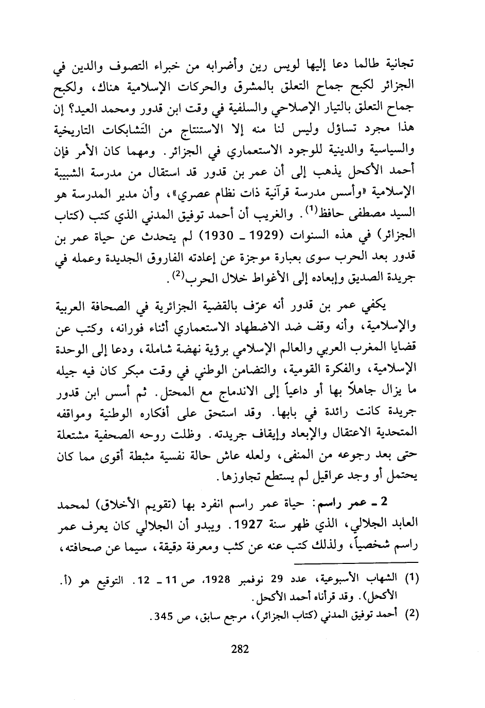 تجانية طالما دعا إليها لويس رين وأضرابه من خبراء التصوف والدين في الجزائر لكبح جماح التعلق بالمشرق والحركات الإسلامية هناك، ولكبح جماح التعلق بالتيار الإصلاحي والسلفية في وقت ابن قدور ومحمد العيد؟ إن هذا مجرد تساؤل وليس لنا منه إلا الاستنتاج من التشابكات التاريخية والسياسية والدينية للوجود الاستعماري في الجزائر. ومهما كان الأمر فإن أحمد الأكحل يذهب إلى أن عمر بن قدور قد استقال من مدرسة الشبيبة الإسلامية (وأسس مدرسة قرآنية ذات نظام عصري)، وأن مدير المدرسة هو السيد مصطفى حافظ (¬1). والغريب أن أحمد توفيق المدني الذي كتب (كتاب الجزائر) في هذه السنوات (1929 - 1930) لم يتحدث عن حياة عمر بن قدور بعد الحرب سوى بعبارة موجزة عن إعادته الفاروق الجديدة وعمله في جريدة الصديق وإبعاده إلى الأغواط خلال الحرب (¬2).