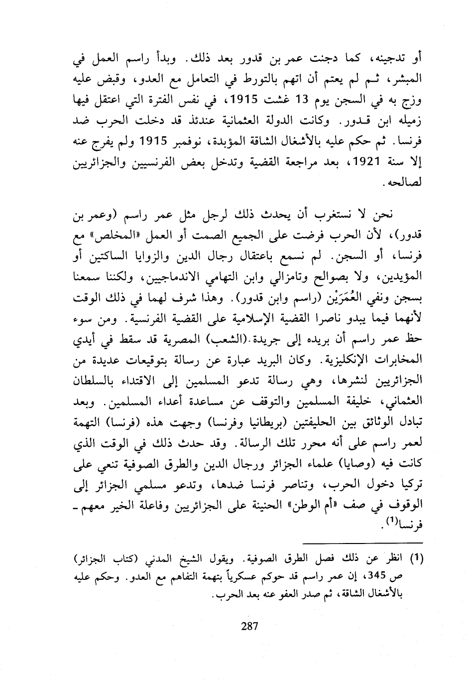 (¬1) انظر عن ذلك فصل الطرق الصوفية. ويقول الشيخ المدني (كتاب الجزائر) ص 345، إن عمر راسم قد حوكم عسكريا، بتهمة التفاهم مع العدو. وحكم عليه بالأشغال الشاقة، ثم صدر العفو عنه بعد الحرب.