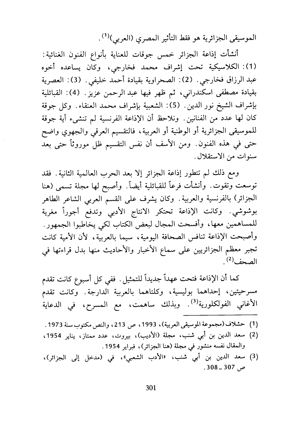 (5): الشعبية بإشراف محمد العنقاء. وكل جوقة كان لها عدد من الفنانين. ونلاحظ أن الإذاعة الفرنسية لم تنشئ أية جوقة للموسيقى الجزائرية أو الوطنية أو العربية، فالتقسيم العرقي والجهوي واضح حتى في هذه الفنون. ومن الأسف أن نفس التقسيم ظل موروثا حتى بعد سنوات من الاستقلال.