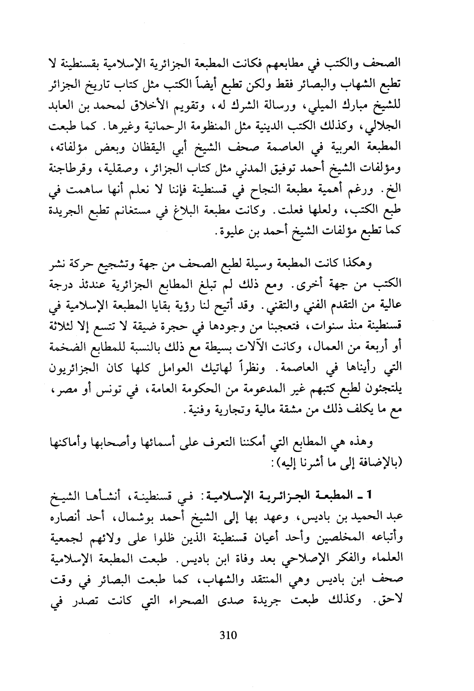 وهكذا كانت المطبعة وسيلة لطبع الصحف من جهة وتشجيع حركة نشر الكتب من جهة أخرى. ومع ذلك لم تبلغ المطابع الجزائرية عندئذ درجة عالية من التقدم الفني والفني. وقد أتيح لنا رؤية بقايا المطبعة الإسلامية في قسنطينة منذ سنوات، فتعجبنا من وجودها في حجرة ضيقة لا تتسع إلا لثلاثة أو أربعة من العمال، وكانت الآلات بسيطة مع ذلك بالنسبة للمطابع الضخمة التي رأيناها في العاصمة. ونظرا لهاتيك العوامل كلها كان الجزائريون يلتجئون لطبع كتبهم غير المدعومة من الحكومة العامة، في تونس أو مصر، مع ما يكلف ذلك من مشقة مالية وتجارية وفنية.