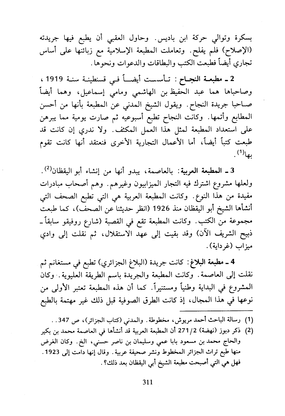 (¬2) ذكر دبوز (نهضة) 2/ 271 أن المطبعة العربية قد أنشأها في العاصمة محمد بن بكير والحاج محمد بن مسعود بابا عمي وسليمان بن ناصر حسني، الخ. وكان الغرض منها طبع تراث الجزائر المخطوط ونشر صحيفة عربية. وقال إنها دامت إلى 1923. فهل هي التي أصبحت مطبعة الشيخ أبي اليقظان بعد ذلك؟.