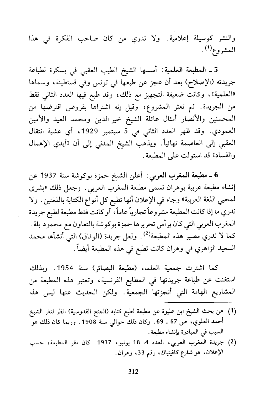 6 - مطبعة المغرب العربي: أعلن الشيخ حمزة بوكوشة سنة 1937 عن إنشاء مطبعة عربية بوهران تسمى مطبعة المغرب العربي. وجعل ذلك (بشرى لمحبي اللغة العربية) وجاء في الإعلان أنها تطبع كل أنواع الكتابة باللغتين. ولا ندري ما إذا كانت المطبعة مشروعا تجاريا عاما، أو كانت فقط مطبعة لطبع جريدة المغرب العربي التي كان يرأس تحريرها حمزة بوكوشة بالتعاون مع محمود بلة. كما لا ندري مصير هذه المطبعة (¬2). ولعل جريدة (الوفاق) التي أنشأها محمد السعيد الزاهري في وهران كانت تطبع في هذه المطبعة أيضا.