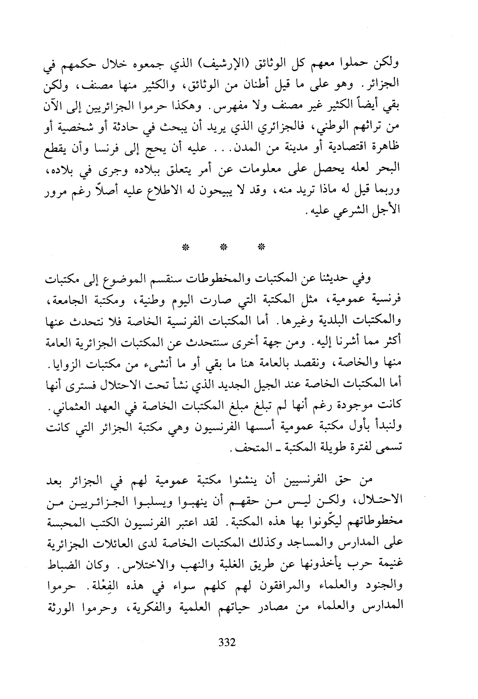 ولكن حملوا معهم كل الوثائق (الإرشيف) الذي جمعوه خلال حكمهم في الجزائر. وهو على ما قيل أطنان من الوثائق، والكثير منها مصنف، ولكن بقي أيضا الكثير غير مصنف ولا مفهرس. وهكذا حرموا الجزائريين إلى الآن من تراثهم الوطني، فالجزائري الذي يريد أن يبحث في حادثة أو شخصية أو ظاهرة اقتصادية أو مدينة من المدن ... عليه أن يحج إلى فرنسا وأن يقطع البحر لعله يحصل على معلومات عن أمر يتعلق ببلاده وجرى في بلاده، وربما قيل له ماذا تريد منه، وقد لا يبيحون له الاطلاع عليه أصلا رغم مرور الأجل الشرعي عليه.