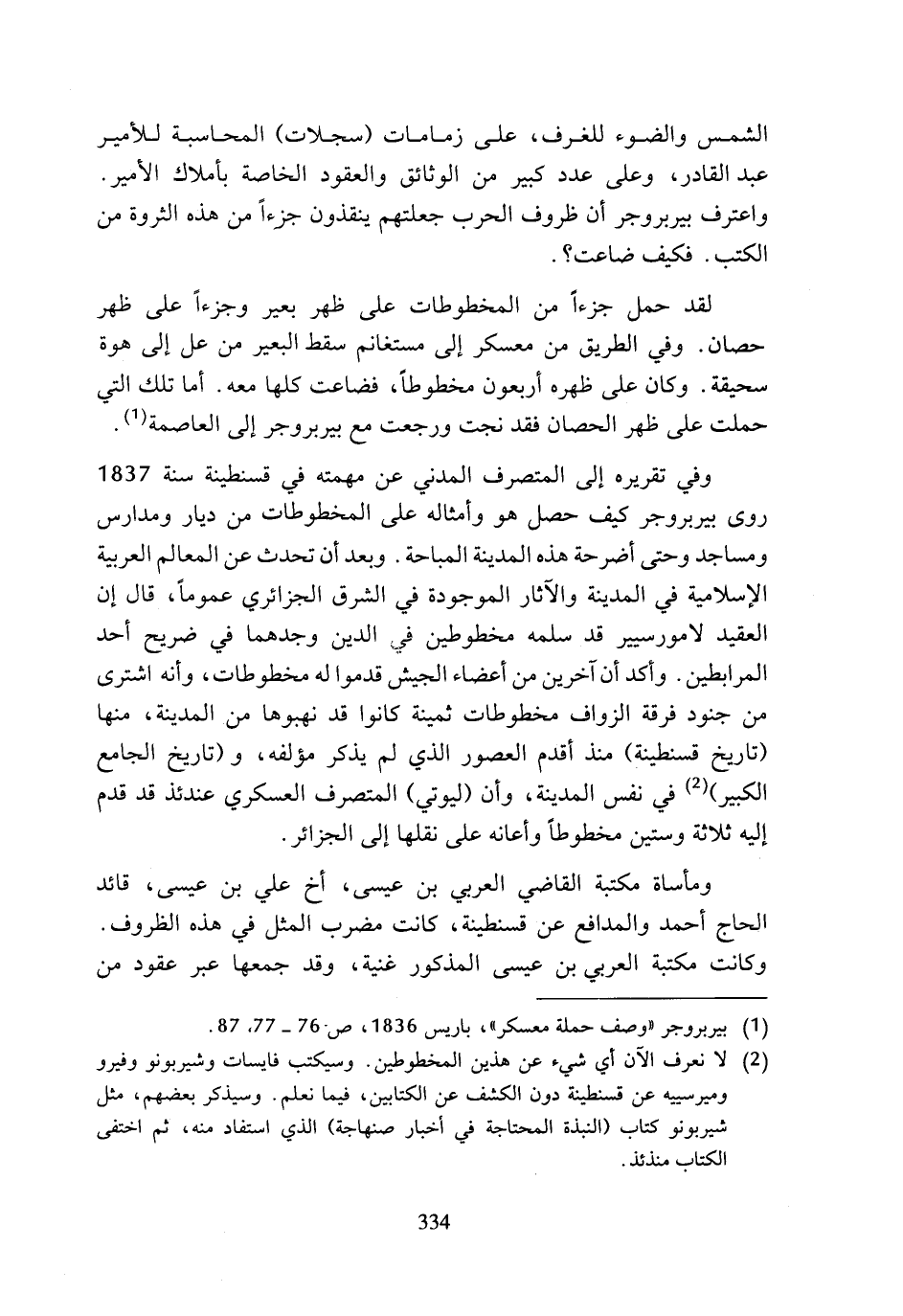 لقد حمل جزءا من المخطوطات على ظهر بعير وجزءا، على ظهر حصان. وفي الطريق من معسكر إلى مستغانم سقط البعير من عل إلى هوة سحيقة. وكان على ظهره أربعون مخطوطا، فضاعت كلها معه. أما تلك التي حملت على ظهر الحصان فقد نجت ورجعت مع بيربروجر إلى العاصمة (¬1).