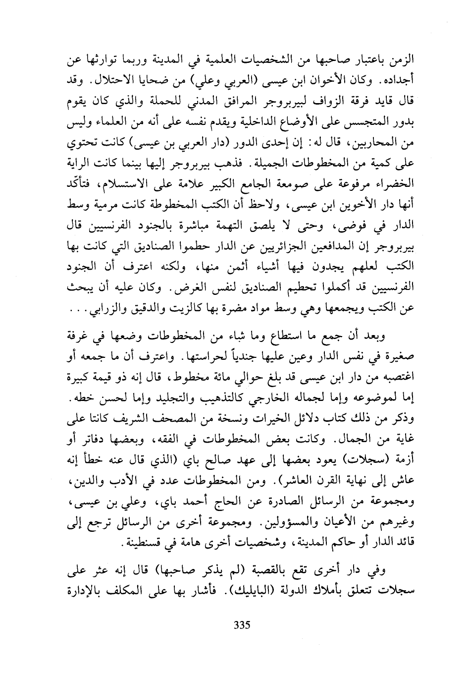 الزمن باعتبار صاحبها من الشخصيات العلمية في المدية وربما توارثها عن أجداده. وكان الأخوان ابن عيسى (العربي وعلي) من ضحايا الاحتلال. وقد قال قايد فرقة الزواف لبيربروجر المرافق المدني للحملة والذي كان يقوم بدور المتجسس على الأوضاع الداخلية وهدم نفسه على أنه من العلماء وليس من المحاربين، قال له: إن إحدى الدور (دار العربي بن عيسى) كانت تحتوي على كمية من المخطوطات الجميلة. فذهب بيربروجر إليها بينما كانت الراية الخضراء مرفوعة على صومعة الجامع الكبير علامة على الاستسلام، فتأكد أنها دار الأخوين ابن عيسى، ولاحظ أن الكتب المخطوطة كانت مرمية وسط الدار في فوضى، وحتى لا يلصق التهمة مباشرة بالجنود الفرنسيين قال بيربروجر إن المدافعين الجزائريين عن الدار حطموا الصناديق التي كانت بها الكتب لعلهم يجدون فيها أشياء أثمن منها، ولكنه اعترف أن الجنود الفرنسيين قد أكملوا تحطيم الصناديق لنفس الغرض. وكان عليه أن يبحث عن الكتب ويجمعها وهي وسط مواد مضرة بها كالزيت والدقيق والزرابي ...