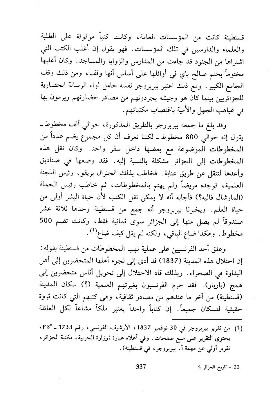 (¬1) من تقرير بيربروجر في 30 نوفمبر 1837، الأرشيف الفرنسي، رقم 1733 - 80 F، يحتوي التقرير على سبع صفحات. وفي أعلاه عبارة (وزارة الحربية، مكتبة الجزائر، تقرير أولي عن مهمة أ. بيربروجر، في قسنطينة).
