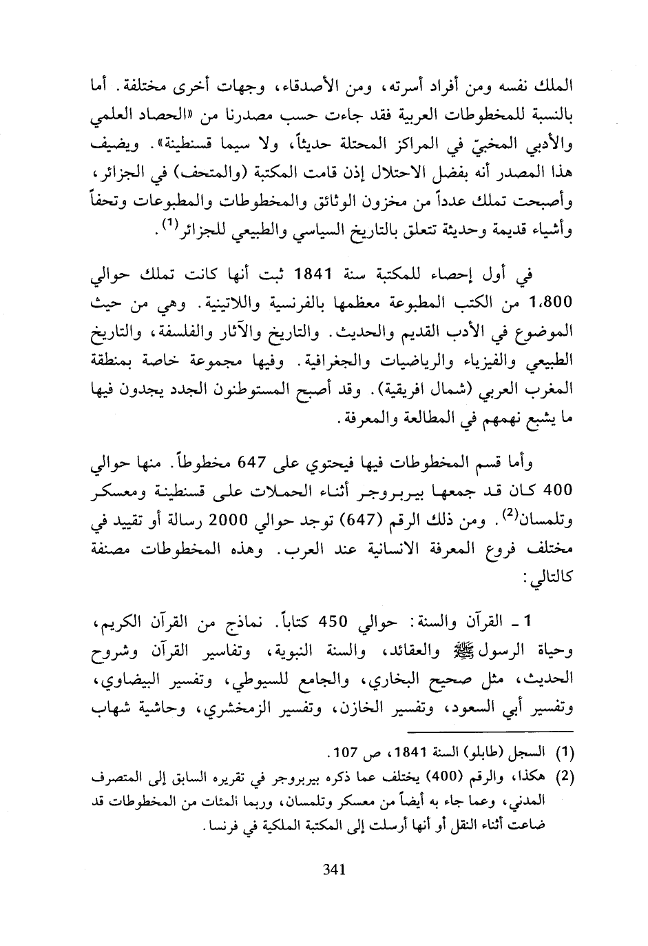 (¬2) هكذا، والرقم (400) يختلف عما ذكره بيربروجر في تقريره السابق إلى المتصرف المدني، وعما جاء به أيضا من معسكر وتلمسان، وربما المئات من المخطوطات قد ضاعت أثناء النقل أو أنها أرسلت إلى المكتبة الملكية في فرنسا.