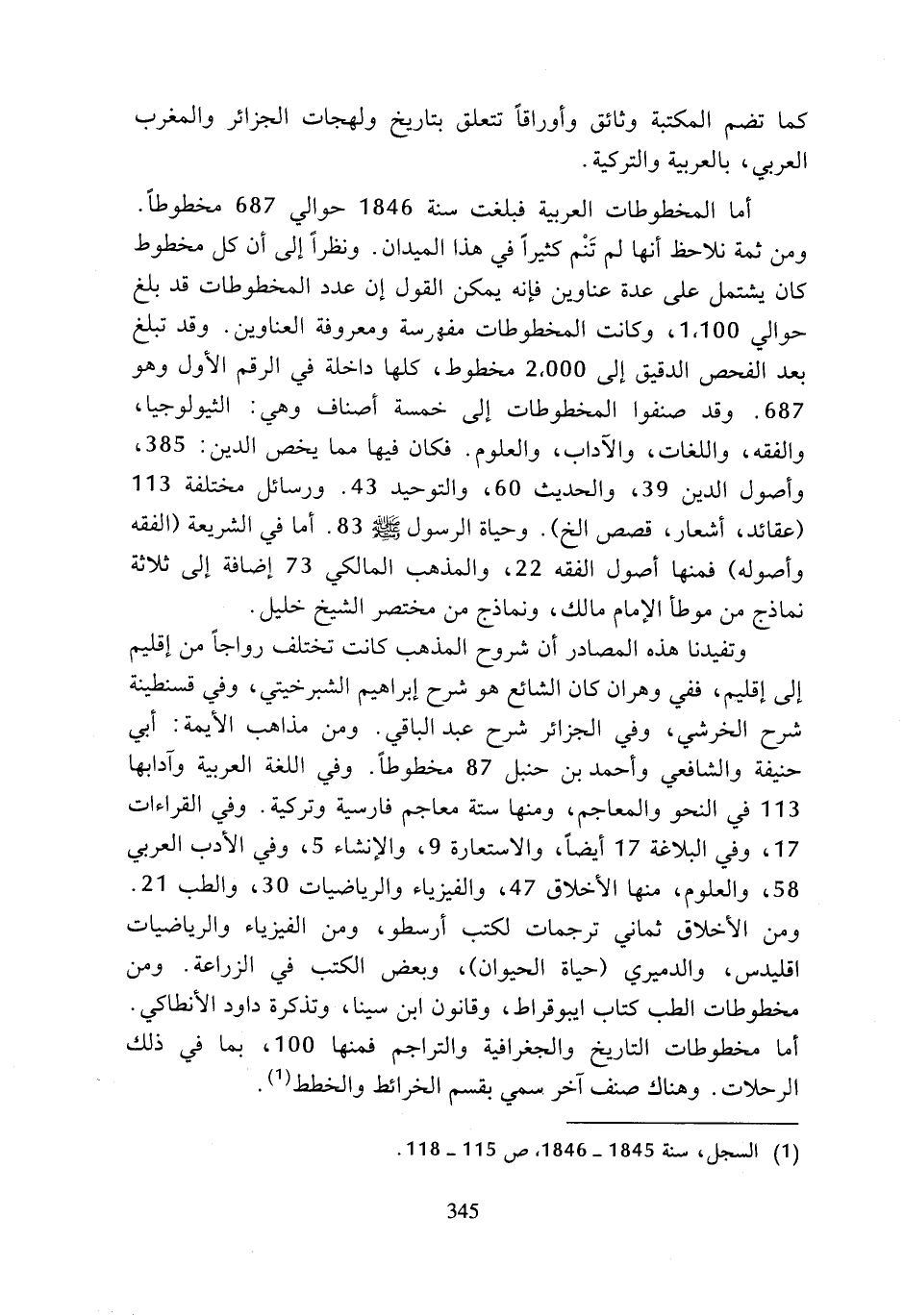 أما المخطوطات العربية فبلغت سنة 1846 حوالي 687 مخطوطا. ومن ثمة نلاحظ أنها لم تنم كثيرا في هذا الميدان. ونظرا إلى أن كل مخطوط كان يشتمل على عدة عناوين فإنه يمكن القول إن عدد المخطوطات قد بلغ حوالي 1، 100، وكانت المخطوطات مفهرسة ومعروفة العناوين. وقد تبلع بعد الفحص الدقيق إلى 2، 000 مخطوط، كلها داخلة في الرقم الأول وهو 687. وقد صنفوا المخطوطات إلى خمسة أصناف وهي: الثيولوجيا، والفقه، واللغات، والآداب، والعلوم. فكان فيها مما يخصص الدين: 385، وأصول الدين 39، والحديث 60، والتوحيد 43. ورسائل مختلفة 113 (عقائد، أشعار، قصص الخ). وحياة الرسول (صلى الله عليه وسلم) 83. أما في الشريعة (الفقه وأصوله) فمنها أصول الفقه 22، والمذهب المالكي 73 إضافة إلى ثلاثة نماذج من موطأ الإمام مالك، ونماذج من مختصر الشيخ خليل.