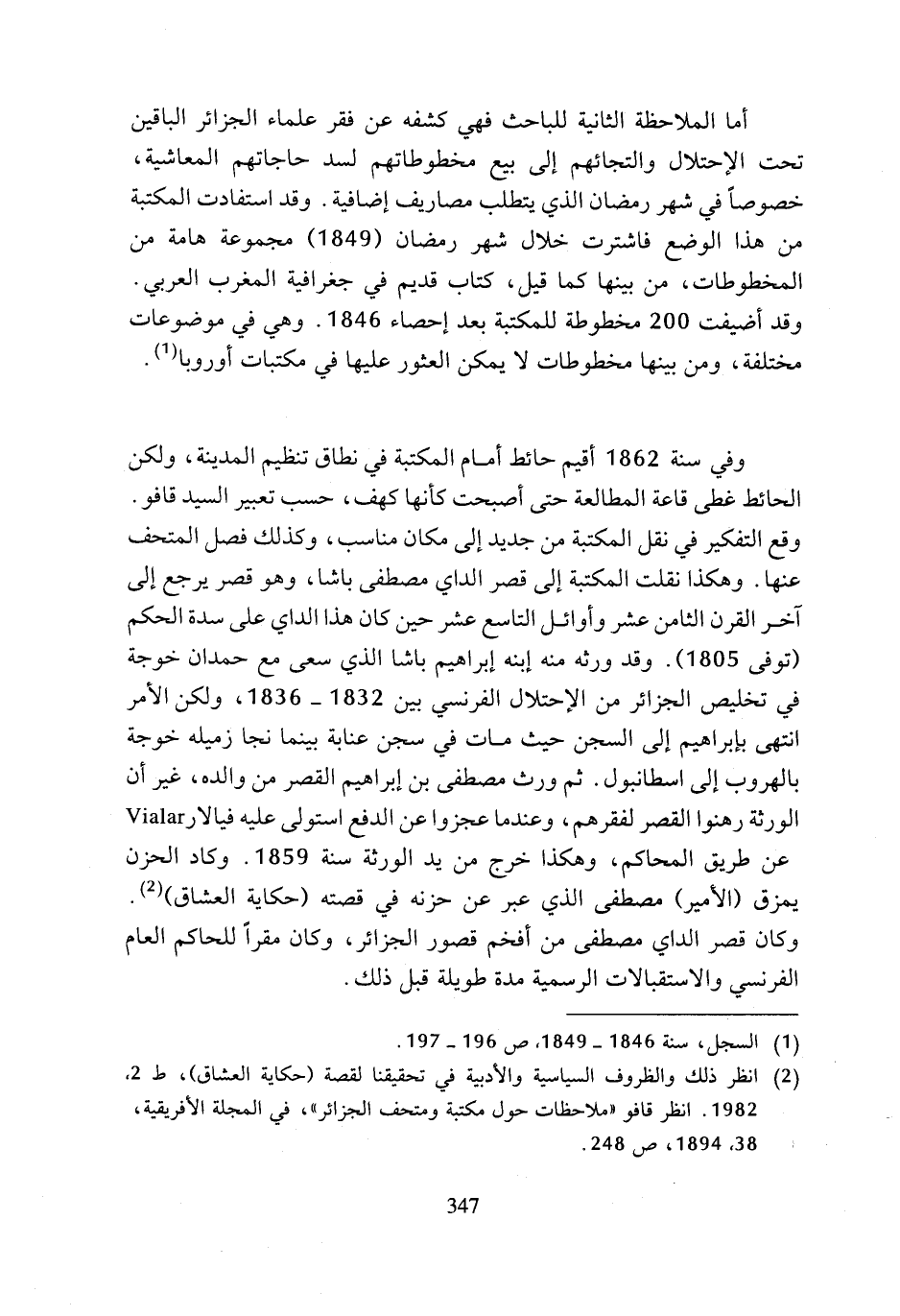 (¬2) انظر ذلك والظروف السياسية والأدبية في تحقيقنا لقصة (حكاية العشاق)، ط 2، 1982. انظر قافو (ملاحظات حول مكتبة ومتحف الجزائر)، في المجلة الأفريقية، 38، 1894، ص 248.