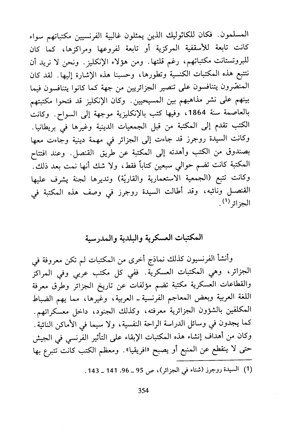 المسلمون. فكان للكاثوليك الذين يمثلون غالبية الفرنسيين مكتباتهم سواء كانت تابعة للأسقفية المركزية أو تابعة لفروعها ومراكزها، كما كان للبروتستانت مكتباتهم، رغم قلتها. ومن هؤلاء الإنكليز. ونحن لا نريد أن نتتبع هذه المكتبات الكنسية وتطورها، وحسبنا هذه الإشارة إليها. لقد كان المنصرون يتنافسون على تنصير الجزائريين من جهة كما كانوا يتنافسون فيما بينهم على نشر مذاهبهم بين المسيحيين. وكان الإنكليز قد فتحوا مكتبتهم بالعاصمة سنة 1864، وفيها كتب بالإنكليزية موجهة إلى السواح. وكانت الكتب تقدم إلى المكتبة من قبل الجمعيات الدينية وغيرها في بريطانيا. وكانت السيدة روجرز قد جاءت إلى الجزائر في مهمة دينية وجاءت معها بصندوق من الكتب وأهدته إلى المكتبة عن طريق القنصل. وعند افتتاح المكتبة كانت تضم حوالي سبعين كتابا فقط، ولا شك أنها نمت بعد ذلك. وكانت تبع (الجمعية الاستعمارية والقارية) وتديرها لجنة يشرف عليها القنصل ونائبه، وقد أطالت السيدة روجرز في وصف هذه المكتبة في الجزائر (¬1).