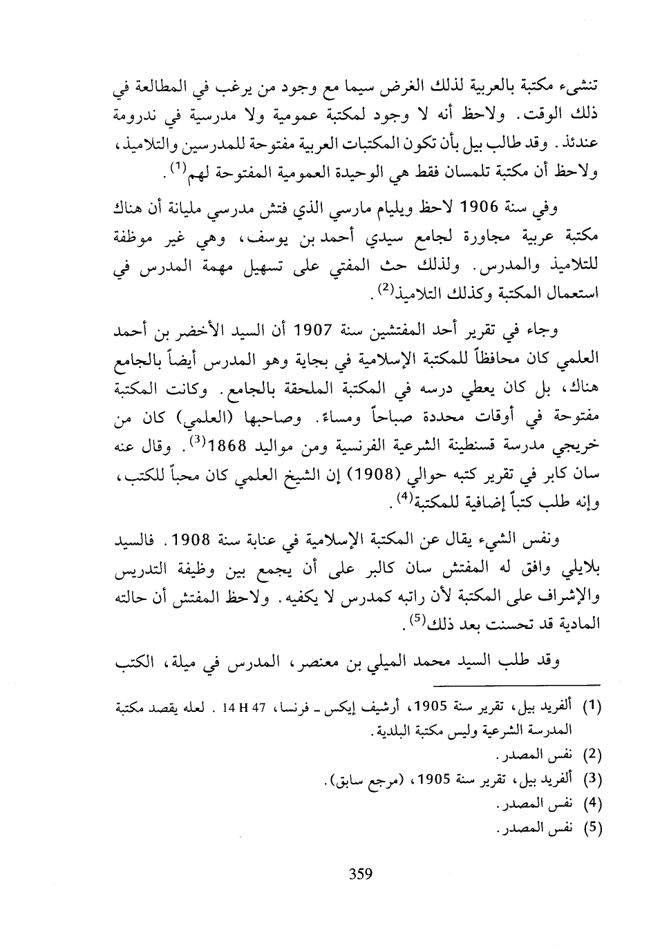 (¬1) ألفريد بيل، تقرير سنة 1905، أرشيف إيكس - فرنسا، 47 H 14 . لعله يقصد مكتبة المدرسة الشرعية وليس مكتبة البلدية.