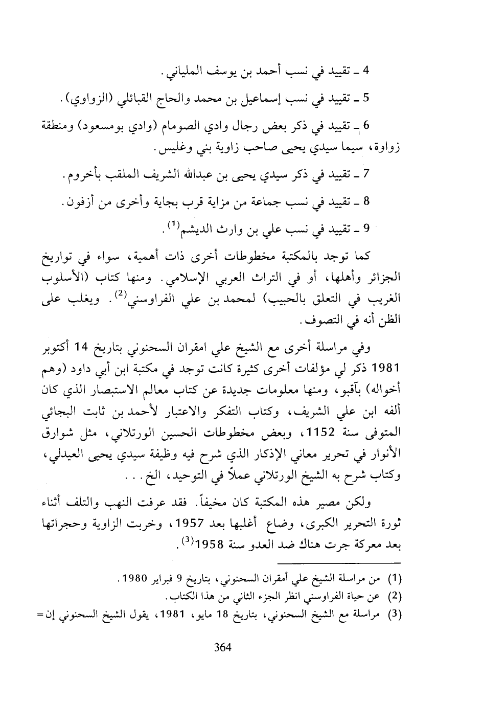 وفي مراسلة أخرى مع الشيخ علي امقران السحنوفي بتاريخ 14 أكتوبر 1981 ذكر لي مؤلفات أخرى كثيرة كانت توجد في مكتبة ابن أبي داود (وهم أخواله) بآقبو، ومنها معلومات جديدة عن كتاب معالم الاستبصار الذي كان ألفه ابن علي الشريف، وكتاب التفكر والاعتبار لأحمد بن تابت البجائي المتوفى سنة 1152، وبعض مخطوطات الحسين الورتلاني، مثل شوارق الأنوار في تحرير معاني الإذكار الذي شرح فيه وظيفة سيدي يحيى العيدلي، وكتاب شرح به الشيخ الورتلاني عملا في التوحيد، الخ ...