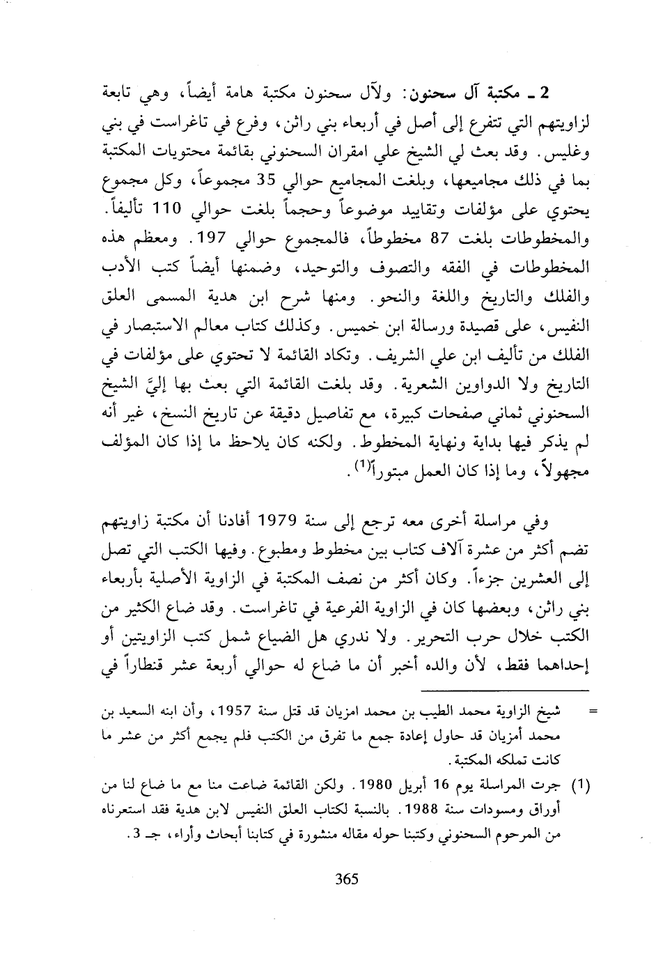 2 - مكتبة آل سحنون: ولآل سحنون مكتبة هامة أيضا، وهي تابعة لزاويتهم التي تتفرع إلى أصل في أربعاء بني راثن، وفرع في تاغراست في بني وغليس. وقد بعث لي الشيخ علي امقران السحنوني بقائمة محتويات المكتبة بما في ذلك مجاميعها، وبلغت المجاميع حوالي 35 مجموعا، وكل مجموع يحتوي على مؤلفات وتقاييد موضوعا وحجما بلغت حوالي 110 تأليفا. والمخطوطات بلغت 87 مخطوطا، فالمجموع حوالي 197. ومعظم هذه المخطوطات في الفقه والتصوف والتوحيد، وضمنها أيضا كتب الأدب والفلك والتاريخ واللغة والنحو. ومنها شرح ابن هدية المسمى العلق النفيس، على قصيدة ورسالة ابن خميس. وكذلك كتاب معالم الاستبصار في الفلك من تأليف ابن علي الشريف. وتكاد القائمة لا تحتوي على مؤلفات في التاريخ ولا الدواوين الشعرية. وقد طغت القائمة التي بعث بها إلي الشيخ السحنوني ثماني صفحات كبيرة، مع تفاصيل دقيقة عن تاريخ النسخ، غير أنه لم يذكر فيها بداية ونهاية المخطوط. ولكنه كان يلاحظ ما إذا كان المؤلف مجهولا، وما إذا كان العمل مبتورا (¬1).