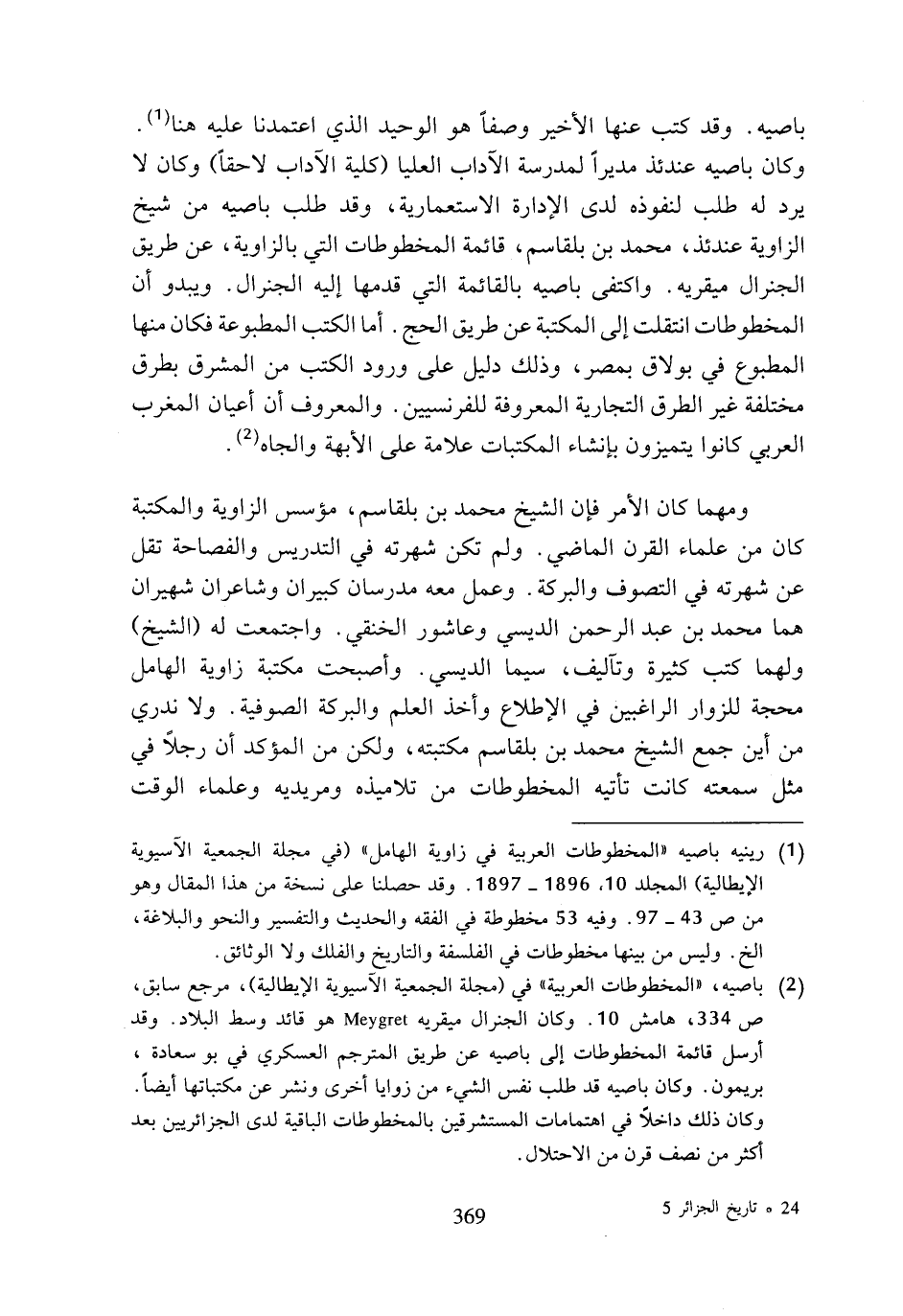 (¬2) باصيه، (المخطوطات العربية) في (مجلة الجمعية الآسيوية الإيطالية)، مرجع سابق، ص 334، هامش 10. وكان الجنرال ميقريه Meygret هو قائد وسط البلاد. وقد أرسل قائمة المخطوطات إلى باصيه عن طريق المترجم العسكري في بو سعادة، بريمون. وكان باصيه قد طلب نفس الشيء من زوايا أخرى ونشر عن مكتباتها أيضا. وكان ذلك داخلا في اهتمامات المستشرقين بالمخطوطات الباقية لدى الجزائريين بعد أكثر من نصف قرن من الاحتلال.