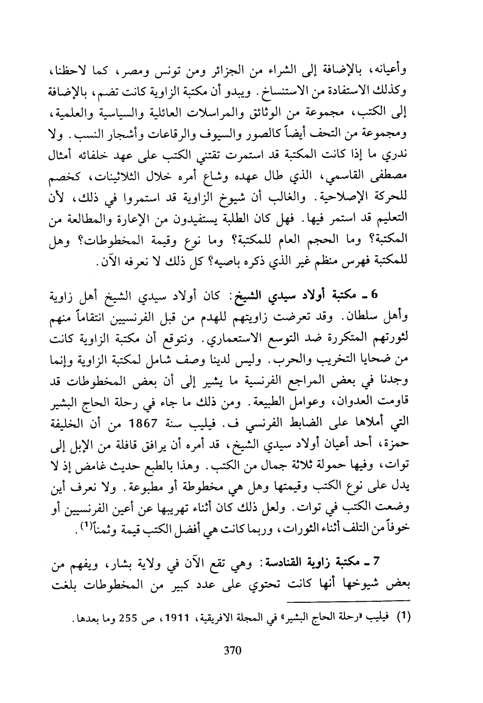6 - مكتبة أولاد سيدي الشيخ: كان أولاد سيدي الشيخ أهل زاوية وأهل سلطان. وقد تعرضت زاويهم للهدم من قبل الفرنسيين انتقاما منهم لثورتهم المتكررة ضد التوسع الاستعماري. ونتوقع أن مكتبة الزاوية كانت من ضحايا التخريب والحرب. وليس لدينا وصف شامل لمكتبة الزاوية وإنما وجدنا في بعض المراجع الفرنسية ما يشير إلى أن بعض المخطوطات قد قاومت العدوان، وعوامل الطبيعة. ومن ذلك ما جاء في رحلة الحاج البشير التي أملاها على الضابط الفرنسي ف. فيليب سنة 1867 من أن الخليفة حمزة، أحد أعيان أولاد سيدي الشيخ، قد أمره أن يرافق قافلة من الإبل إلى توات، وفيها حمولة ثلاثة جمال من الكتب. وهذا بالطبع حديث غامض إذ لا يدل على نوع الكتب وقيمتها وهل هي مخطوطة أو مطبوعة. ولا نعرف أين وضعت الكتب في توات. ولعل ذلك كان أثناء تهريبها عن أعين الفرنسيين أو خوفا. من التلف أثناء الثورات، وربما كانت هي أفضل الكتب قيمة وثمنا (¬1).