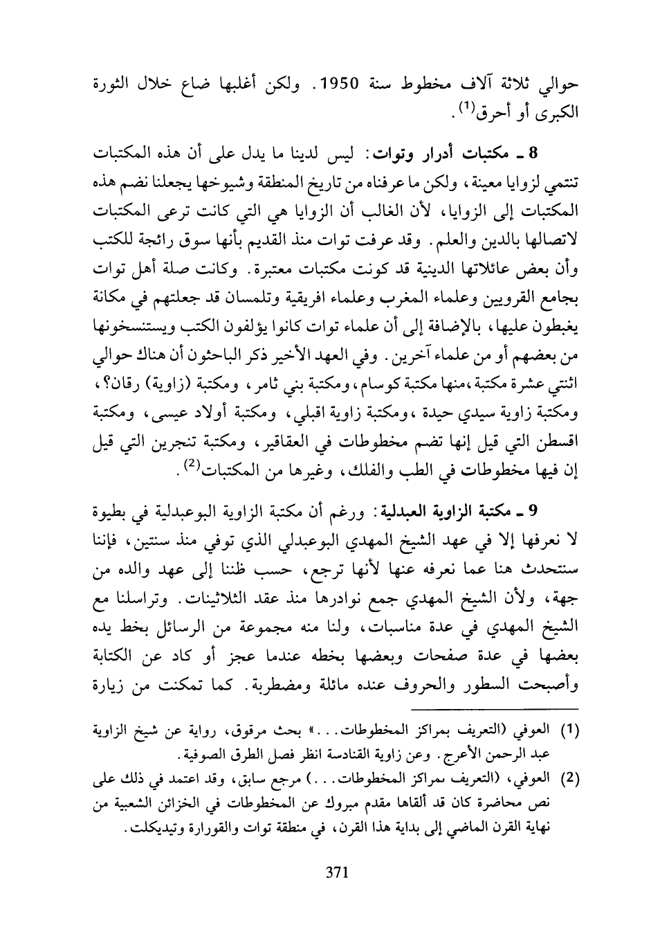 (¬2) العوفي، (التعريف بمراكز المخطوطات ...) مرجع سابق، وقد اعتمد في ذلك على نص محاضرة كان قد ألقاها مقدم مبروك عن المخطوطات في الخزائن الشعبية من نهاية القرن الماضي إلى بداية هذا القرن، في منطقة توات والقورارة وتيديكلت.