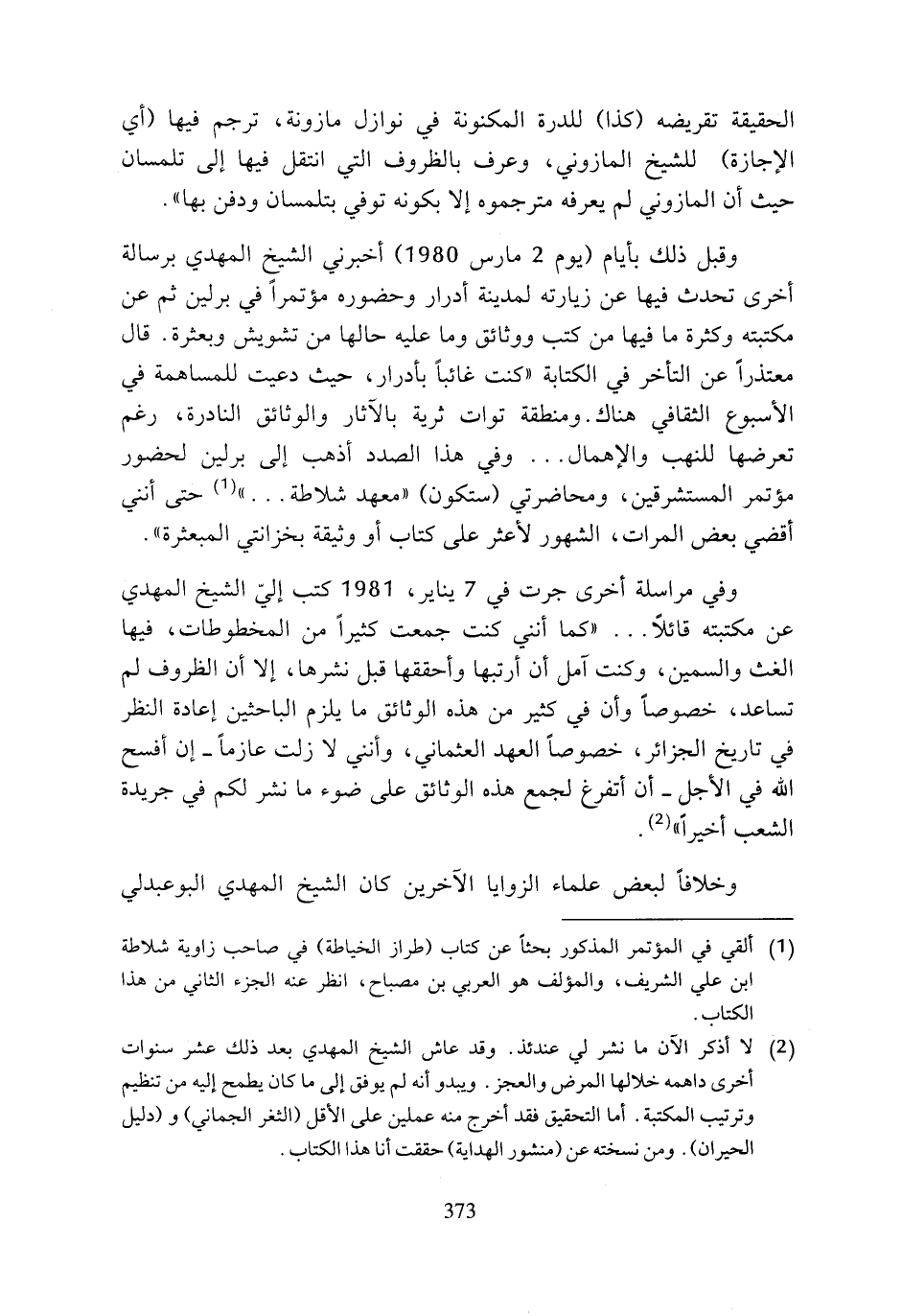 وقبل ذلك بأيام (يوم 2 مارس 1980) أخبرني الشيخ المهدي برسالة أخرى تحدث فيها عن زيارته لمدينة أدرار وحضوره مؤتمرا في برلين ثم عن مكتبته وكثرة ما فيها من كتب ووثائق وما عليه حالها من تشويش وبعترة. قال معتذرا عن التأخر في الكتابة (كنت غائبا بأدرار، حيث دعيت للمساهمة في الأسبوع الثقافي هناك. ومنطقة توات ثرية بالآثار والوثائق النادرة، رغم تعرضها للنهب والإهمال ... وفي هذا الصدد أذهب إلى برلين لحضور مؤتمر المستشرقين، ومحاضرتي (ستكون) (معهد شلاطة ...) (¬1) حتى أنني أقضي بعض المرات، الشهور لأعثر على كتاب أو وثيقة بخزانتي المبعثرة).