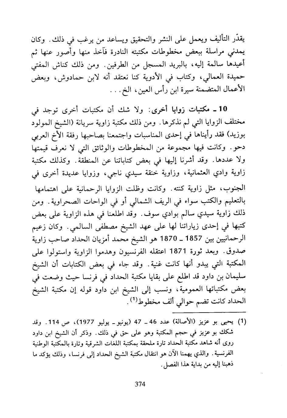 (¬1) يحيى بوعزيز (الأصالة) عدد 46 - 47 (يونيو - يوليو 1977)، ص 114. وقد شكك بوعزيز في حجم المكتبة وهو على حق في ذلك. وذكر أن الشيخ ابن داود روى أنه شاهد مكتبة الحداد تارة ملحقة بمكتبة اللغات الشرقية وتارة بالمكتبة الوطنية الفرنسية. والذي يهمنا الآن هو انتقال مكتبة الشيخ الحداد إلى فرنسا، وذلك يؤكد ما ذهبنا إليه من بداية هذا الفصل.