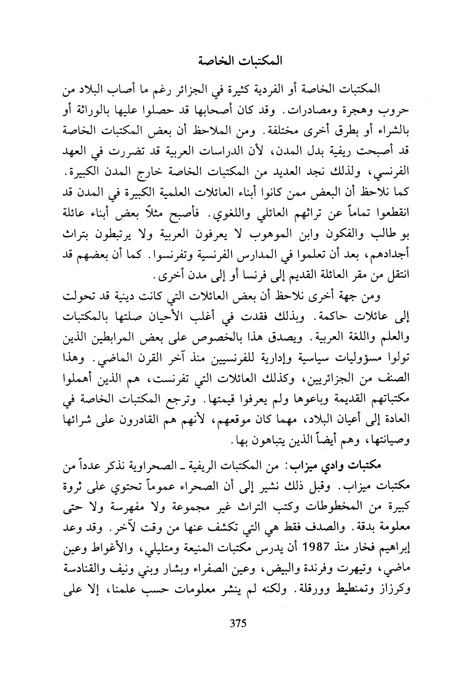 مكتبات وادي ميزاب: من المكتبات الريفية - الصحراوية نذكر عددا، من مكتبات ميزاب. وقبل ذلك نشير إلى أن الصحراء عموما، تحتوي على ثروة كبيرة من المخطوطات وكتب التراث غير مجموعة ولا مفهرسة ولا حتى معلومة بدقة. والصدف فقط هي التي تكشف عنها من وقت لآخر. وقد وعد إبراهيم فخار منذ 1987 أن يدرس مكتبات المنيعة ومتليلي، والأغواط وعين ماضي، وتيهرت وفرندة والبيض، وعين الصفراء وبشار وبني ونيف والقنادسة وكرزاز وتمنطيط وورقلة. ولكنه لم ينشر معلومات حسب علمنا، إلا على