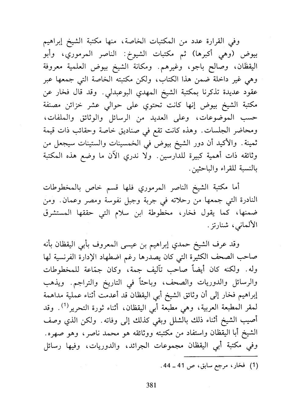 وقد عرف الشيخ حمدي إبراهيم بن عيسى المعروف لأبي اليقظان بأنه صاحب الصحف الكثيرة التي كان يصدرها رغم اضطهاد الإدارة الفرنسية لها وله. ولكنه كان أيضا صاحب تآليف جمة، وكان جماعة للمخطوطات والرسائل والدوريات والصحف، وباحثا في التاريخ والتراجم. ويذهب إبراهيم فخار إلى أن وثائق الشيخ أبي اليقظان قد أعدمت أثناء عملية مداهمة لمقر المطبعة العربية، وهي مطبعة أبي اليقظان، أثناء ثورة التحرير (¬1). وقد أصيب الشيخ أثناء ذلك بالشلل وبقي كذلك إلى وفاته. ولكن الذي وصف الشيخ أبا اليقظان واستفاد من مكتبته ووثائقه هو محمد ناصر، وهو صهره. وفي مكتبة أبي اليقظان مجموعات الجرائد، والدوريات، وفيها رسائل