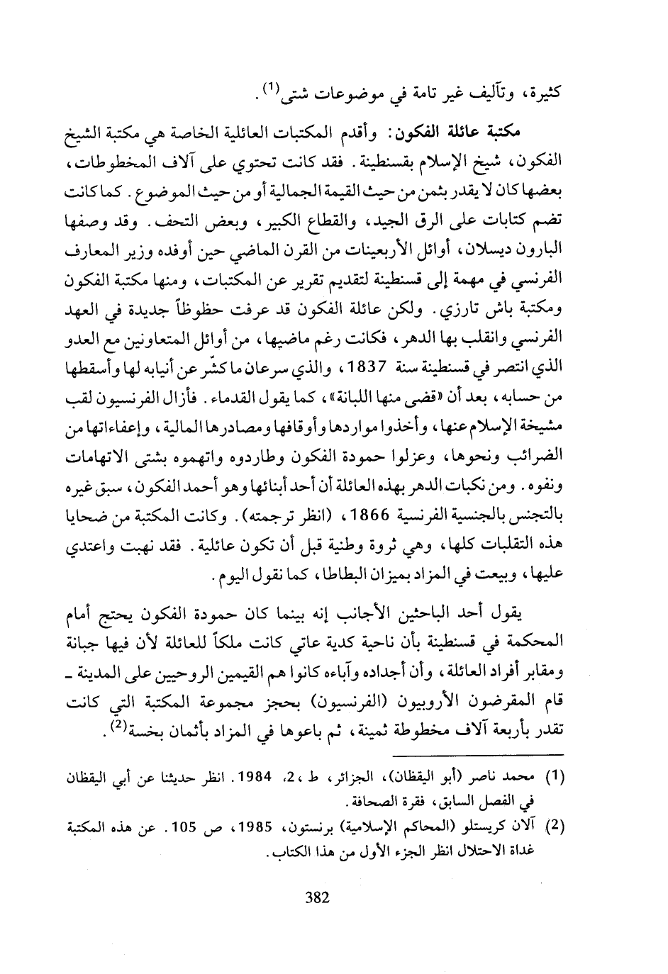 مكتبة عائلة الفكون: وأقدم المكتبات العائلية الخاصة هي مكتبة الشيخ الفكون، شيخ الإسلام بقسنطينة. فقد كانت تحتوي على آلاف المخطوطات، بعضها كان لا يقدر بثمن من حيث القيمة الجمالية أو من حيث الموضوع. كما كانت تضم كتابات على الرق الجيد، والقطاع الكبير، وبعض التحف. وقد وصفها البارون ديسلان، أوائل الأربعينات من القرن الماضي حين أوفده وزير المعارف الفرنسي في مهمة إلى قسنطينة لتقديم تقرير عن المكتبات، ومنها مكتبة الفكون ومكتبة باشں تارزي. ولكن عائلة الفكون قد عرفت حظوظا جديدة في العهد الفرنسي وانقلب بها الدهر، فكانت رغم ماضيها، من أوائل المتعاونين مع العدو الذي انتصر في قسنطينة سنة 1837، والذي سرعان ما كشر عن أنيابه لها وأسقطها من حسابه، بعد أن (قضى منها اللبانة)، كما يقول القدماء. فأزال الفرنسيون لقب مشيخة الإسلام عنها، وأخذوا مواردها وأوقافها ومصادرها المالية، وإعفاءاتها من الضرائب ونحوها، وعزلوا حمودة الفكون وطاردوه واتهموه بشتى الاتهامات ونفوه. ومن نكبات الدهر بهذه العائلة أن أحد أبنائها وهو أحمد الفكون، سبق غيره بالتجنس بالجنسية الفرنسية 1866، (انظر ترجمته). وكانت المكتبة من ضحايا هذه التقلبات كلها، وهي ثروة وطنية قبل أن تكون عائلية. فقد نهبت واعتدي عليها، وبيعت في المزاد بميزان البطاطا، كما نقول اليوم.