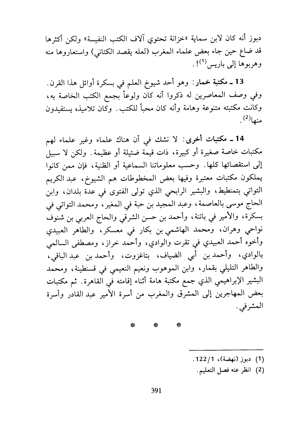 13 - مكتبة خمار: وهو أحد شيوخ العلم في بسكرة أوائل هذا القرن. وفي وصف المعاصرين له ذكروا أنه كان ولوعا بجمع الكتب الخاصة به، وكانت مكتبته متنوعة وهامة وأنه كان محبا للكتب. وكان تلاميذه يستفيدون منها (¬2).