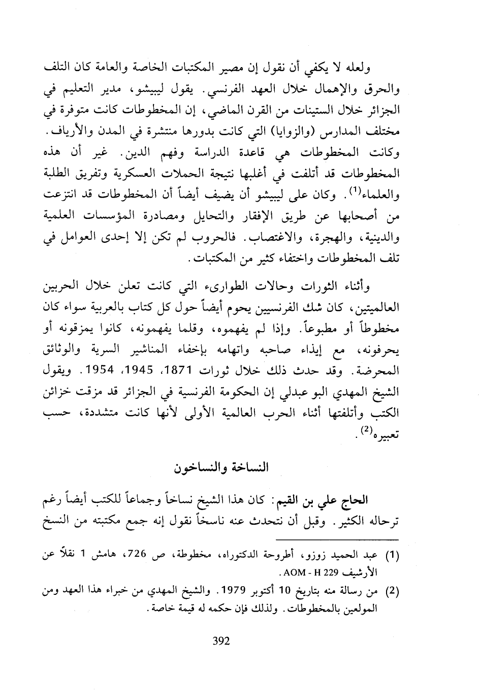ولعله لا يكفي أن نقول إن مصير المكتبات الخاصة والعامة كان التلف والحرق والإهمال خلال العهد الفرنسي. يقول ليبيشو، مدير التعليم في الجزائر خلال الستينات من القرن الماضي، إن المخطوطات كانت متوفرة في مختلف المدارس (والزوايا) التي كانت بدورها منتشرة في المدن والأرياف. وكانت المخطوطات هي قاعدة الدراسة وفهم الدين. غير أن هذه المخطوطات قد أتلفت في أغلبها نتيجة الحملات العسكرية وتفريق الطلبة والعلماء (¬1). وكان على ليبيشو أن يضيف أيضا، أن المخطوطات قد انتزعت من أصحابها عن طريق الإفقار والتحايل ومصادرة المؤسسات العلمية والدينية، والهجرة، والاغتصاب. فالحروب لم تكن إلا إحدى العوامل في تلف المخطوطات واختفاء كثير من المكتبات.