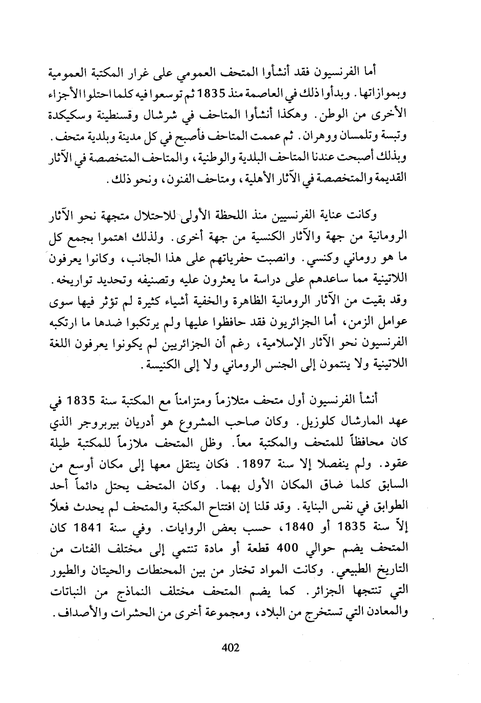 أما الفرنسيون فقد أنشأوا المتحف العمومي على غرار المكتبة العمومية وبموازاتها. وبدأوا ذلك في العاصمة منذ 1835 ثم تو سعوا فيه كلما احتلوا الأجزاء الأخرى من الوطن. وهكذا أنشأوا المتاحف في شرشال وقسنطينة وسكيكدة وتبسة وتلمسان ووهران. ثم عممت المتاحف فأصبح في كل مدينة وبلدية متحف. وبذلك أصبحت عندنا المتاحف البلدية والوطنية، والمتاحف المتخصصة في الآثار القديمة والمتخصصة في الآثار الأهلية، ومتاحف الفنون، ونحو ذلك.