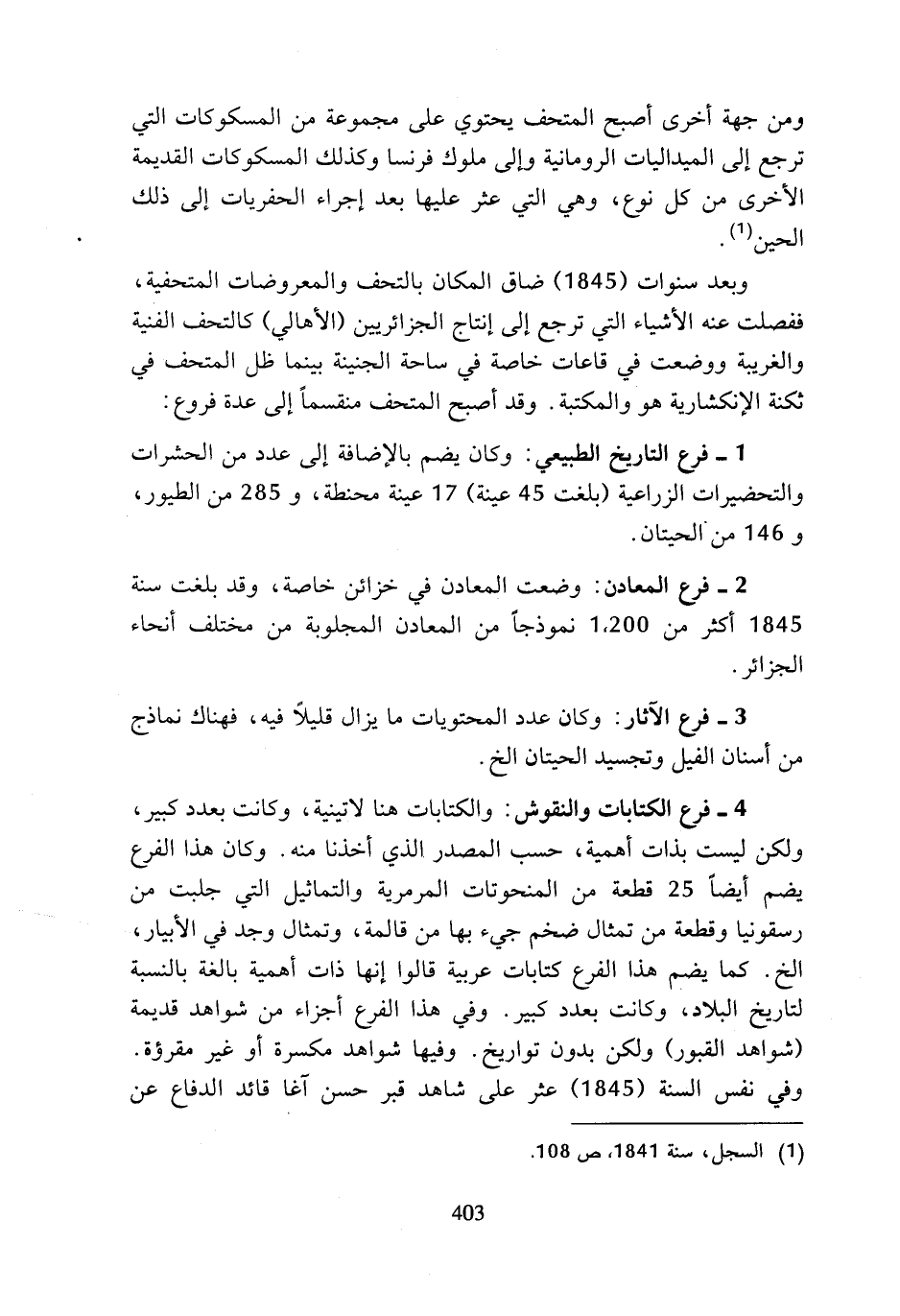 4 - فرع الكتابات والنقوش: والكتابات هنا لاتينية، وكانت بعدد كبير، ولكن ليست بذات أهمية، حسب المصدر الذي أخذنا منه. وكان هذا الفرع يضم أيضا 25 قطعة من المنحوتات المرمرية والتماثيل التي جلبت من رسقونيا وقطعة من تمثال ضخم جيء بها من قالمة، وتمثال وجد في الأبيار، الخ. كما يضم هذا الفرع كتابات عربية قالوا إنها ذات أهمية بالغة بالنسبة لتاريخ البلاد، وكانت بعدد كبير. وفي هذا الفرع أجزاء من شواهد قديمة (شواهد القبور) ولكن بدون تواريخ. وفيها شواهد مكسرة أو غير مقرؤة. وفي نفس السنة (1845) عثر على شاهد قبر حسن آغا قائد الدفاع عن