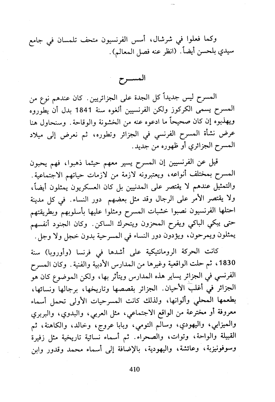 المسرح ليس جديدا كل الجدة على الجزائريين. كان عندهم نوع من المسرح يسمى الكركوز ولكن الفرنسيين ألغوه سنة 1841 بدل أن يطوروه ويهذبوه إن كان صحيحا ما ادعوه عنه من الخشونة والوقاحة. وسنحاول هنا عرض نشأة المسرح الفرنسي في الجزائر وتطوره، ثم نعرض إلى ميلاد المسرح الجزائري أو ظهوره من جديد.
