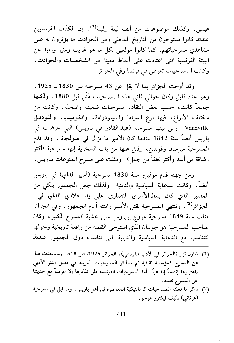 (¬1) شارل تيار (الجزائر في الأدب الفرنسي)، الجزائر 1925، ص 518. وسنتحدث هنا عن المسرح كمؤسسة ثقافية ثم سنذكر المسرحيات العربية في فصل النثر الأدبي باعتبارها إنتاجا إبداعيا. أما المسرحيات الفرنسية فلن نذكرها إلا عرضا مع حديثنا عن المسرح نفسه.