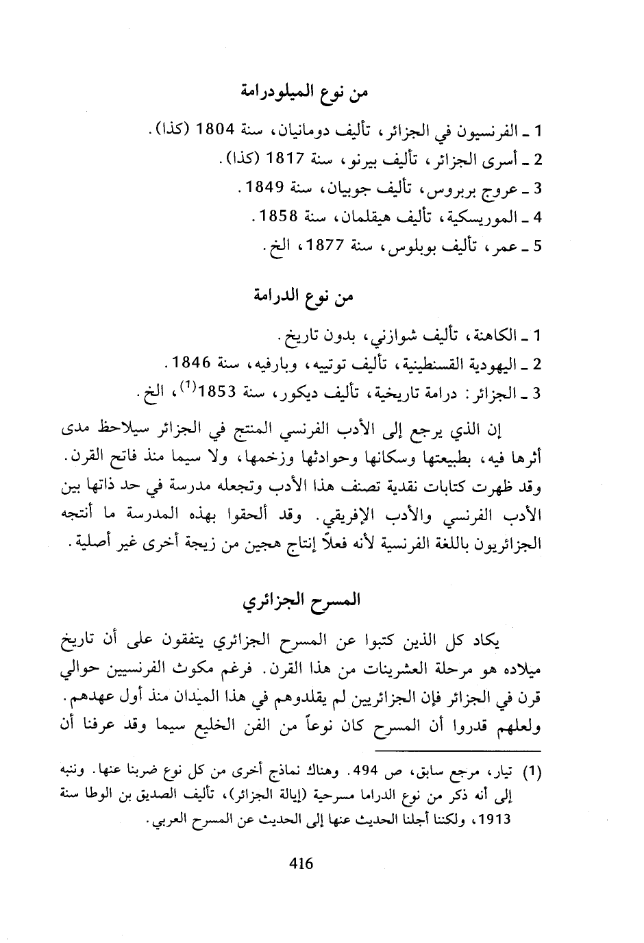 (¬1) تيار، مرجع سابق، ص 494. وهناك نماذج أخرى من كل نوع ضربنا عنها. وننبه إلى أنه ذكر من نوع الدراما مسرحية (إزلة الجزائر)، تأليف الصديق بن الوطا سنة 1913، ولكننا أجلنا الحديث عنها إلى الحديث عن المسرح العربي.