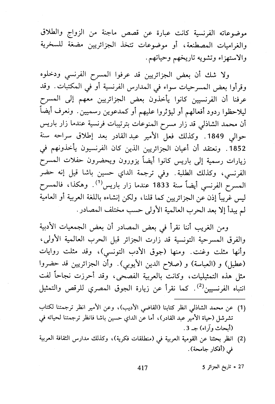 ولا شك أن بعض الجزائريين قد عرفوا المسرح الفرنسي ودخلوه وقرأوا بعض المسرحيات سواء في المدارس الفرنسية أو في المكتبات. وقد عرفنا أن الفرنسيين كانوا يأخذون بعض الجزائريين معهم إلى المسرح ليلاحظوا ردود أفعالهم أو ليؤثروا عليهم أو كمدعوين رسميين. ونعرف أيضا أن محمد الشاذلي قد زار مسرح المنوعات بترتيبات فرنسية عندما زار باريس حوالي 1849. وكذلك فعل الأمير عبدالقادر بعد إطلاق سراحه سنة 1852. ونعتقد أن أعيان الجزائريين الذين كان الفرنسيون يأخذونهم في زيارات رسمية إلى باريس كانوا أيضا يزورون ويحضرون حفلات المسرح الفرنسي، وكذلك الطلبة. وفي ترجمة الداي حسين باشا قيل إنه حضر المسرح الفرنسي أيضا سنة 1833 عندما زار باريس (¬1). وهكذا، فالمسرح ليس غريبا إذن عن الجزائريين كما قلنا، ولكن إنشاءه باللغة العربية أو العامية لم يبدأ إلا بعد الحرب العالمية الأولى حسب مختلف المصادر.