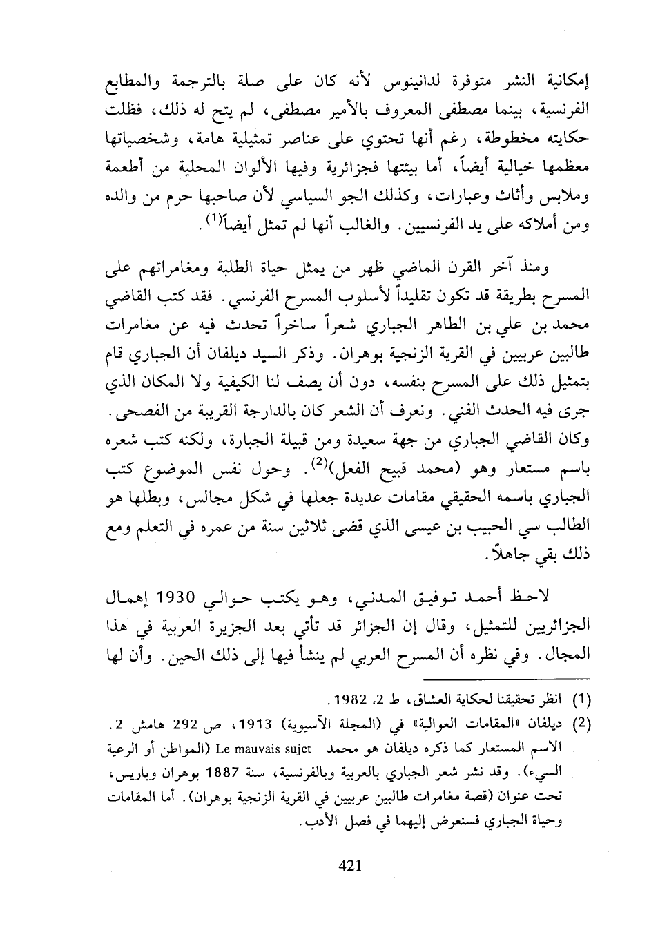 (¬2) ديلفان (المقامات العوالية) في (المجلة الآسيوية) 1913، ص 292 هامش 2. الاسم المستعار كما ذكره ديلفان هو محمد Le mauvais sujet (المواطن أو الرعية السيء). وقد نشر شعر الجباري بالعربية وبالفرنسية، سنة 1887 بوهران وباريس، تحت عنوان (قصة مغامرات طالبين عريين في القرية الزنجية بوهران). أما المقامات وحياة الجباري فسنعرض إليهما في فصل الأدب.