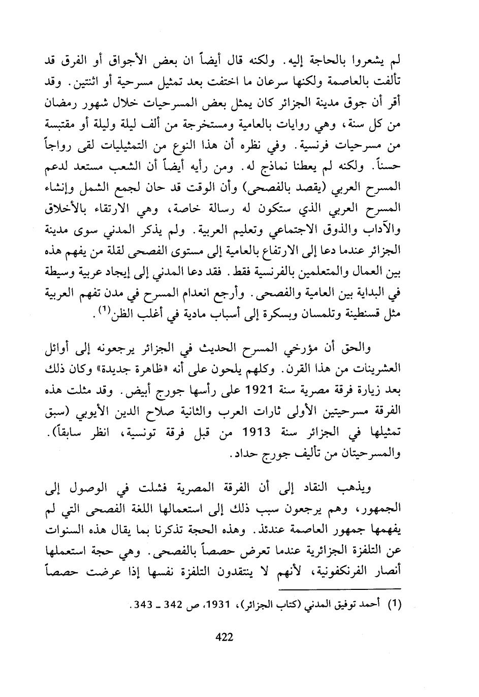 لم يشعروا بالحاجة إليه. ولكنه قال أيضا ان بعض الأجواق أو الفرق قد تألفت بالعاصمة ولكنها سرعان ما اختفت بعد تمثيل مسرحية أو اثنتين. وقد أقر أن جوق مدينة الجزائر كان يمثل بعض المسرحيات خلال شهور رمضان من كل سنة، وهي روايات بالعامية ومستخرجة من ألف ليلة وليلة أو مقتبسة من مسرحيات فرنسية. وفي نظره أن هذا النوع من التمثيليات لقى رواجا حسنا. ولكنه لم يعطنا نماذج له. ومن رأيه أيضا أن الشعب مستعد لدعم المسرح العربي (يقصد بالفصحى) وأن الوقت قد حان لجمع الشمل وإنشاء المسرح العربي الذي ستكون له رسالة خاصة، وهي الارتقاء بالأخلاق والآداب والذوق الاجتماعي وتعليم العربية. ولم يذكر المدني سوى مدينة الجزائر عندما دعا إلى الارتفاع بالعامية إلى مستوى الفصحى لقلة من يفهم هذه بين العمال والمتعلمين بالفرنسية فقط. فقد دعا المدني إلى إيجاد عربية وسيطة في البداية بين العامية والفصحى. وأرجع انعدام المسرح في مدن تفهم العربية مثل قسنطينة وتلمسان وبسكرة إلى أسباب مادية في أغلب الظن (¬1).