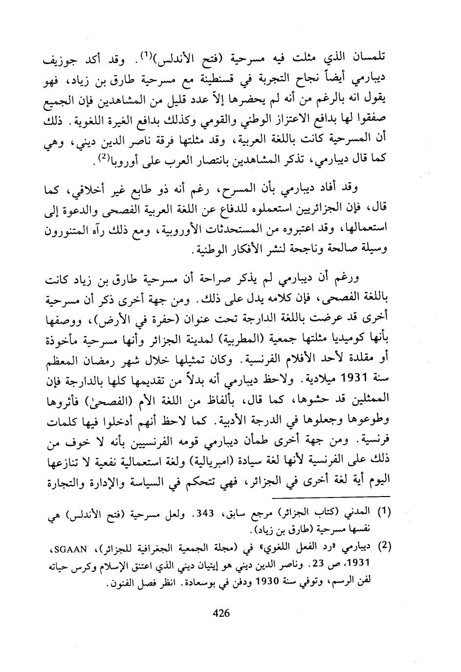 تلمسان الذي مثلت فيه مسرحية (فتح الأندلس) (¬1). وقد أكد جوزيف ديبارمي أيضا نجاح التجربة في قسنطينة مع مسرحية طارق بن زياد، فهو يقول انه بالرغم من أنه لم يحضرها إلا عدد قليل من المشاهدين فإن الجميع صفقوا لها بدافع الاعتزاز الوطني والقومي وكذلك بدافع الغيرة اللغوية. ذلك أن المسرحية كانت باللغة العربية، وقد مثلتها فرقة ناصر الدين ديني، وهي كما قال ديبارمي، تذكر المشاهدين بانتصار العرب على أوروبا (¬2).