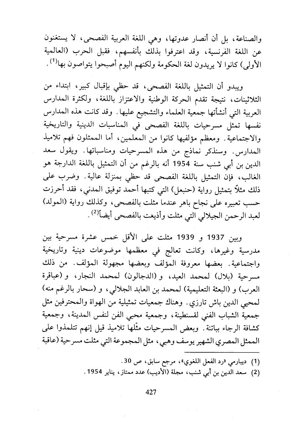 والصناعة، بل أن أنصار عدوتها، وهي اللغة العربية الفصحى، لا يستغنون عن اللغة الفرنسية، وقد اعترفوا بذلك بأنفسهم، فقبل الحرب (العالمية الأولى) كانوا لا يريدون لغة الحكومة ولكنهم اليوم أصبحوا يتواصون بها (¬1).