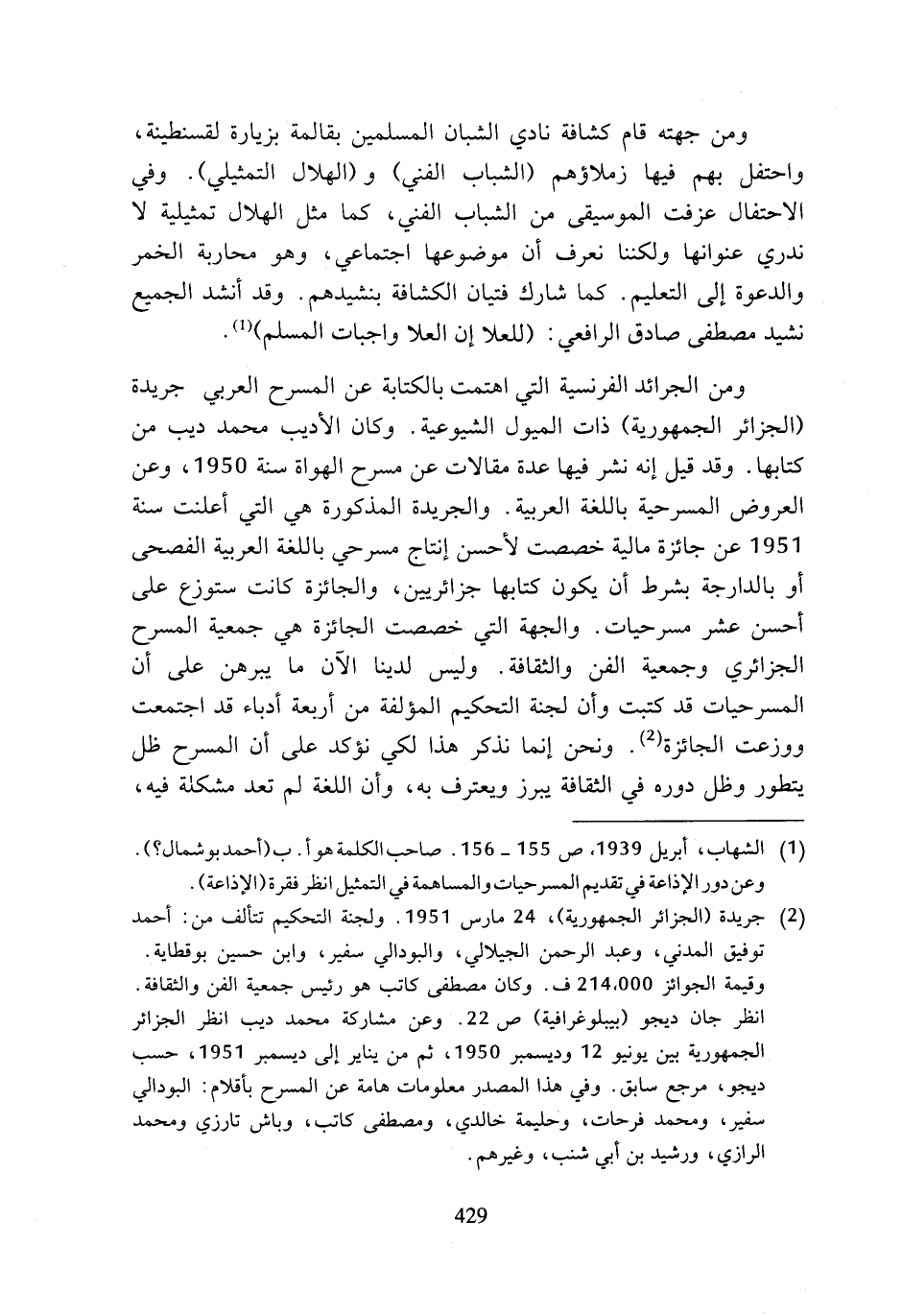 (¬2) جريدة (الجزائر الجمهورية)، 24 مارس 1951. ولجنة التحكيم تتألف من: أحمد توفيق المدني، وعبد الرحمن الجيلالي، والبودالي سفير، وابن حسين بوقطاية. وقيمة الجوائز 214، 000 ف. وكان مصطفى كاتب هو رئيس جمعية الفن والثقافة. انظر جان ديجو (بيبلوغرافية) ص 22. وعن مشاركة محمد ديب انظر الجزائر الجمهورية بين يونيو 12 وديسمبر 1950، ثم من يناير إلى ديسمبر 1951، حسب ديجو، مرجع سابق. وفي هذا المصدر معلومات هامة عن المسرح بأقلام: البودالي سفير، ومحمد فرحات، وحليمة خالدي، ومصطفى كاتب، وباش تارزي ومحمد الرازي، ورشيد بن أبى شنب، وغيرهم.
