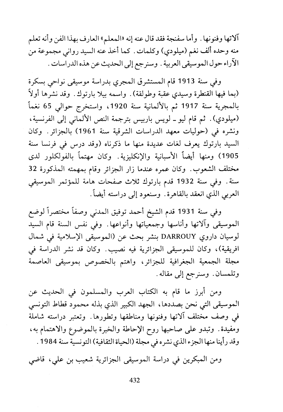 وفي سنة 1913 قام المستشرق المجري بدراسة موسيقى نواحي بسكرة (بما فيها القنطرة وسيدي عقبة وطولقة). واسمه بيلا بارتوك. وقد نشرها أولا بالمجرية سنة 1917 ثم بالألمانية سنة 1920، واستخرج حوالي 65 نغما (ميلودي). ثم قام ليو - لويس باربيس بترجمة النص الألماني إلى الفرنسية، ونشره في (حوليات معهد الدراسات الشرقية سنة 1961) بالجزائر. وكان السيد بارتوك يعرف لغات عديدة منها ما ذكرناه (وقد درس في فرنسا سنة 1905) ومنها أيضا الأسبانية والإنكليزية. وكان مهتما بالفولكلور لدى مختلف الشعوب. وكان عمره عندما زار الجزائر وقام بمهمته المذكورة 32 سنة. وفي سنة 1932 قدم بارتوك ثلاث صفحات هامة للمؤتمر الموسيقي العربي الذي انعقد بالقاهرة. وسنعود إلى دراسته أيضا.