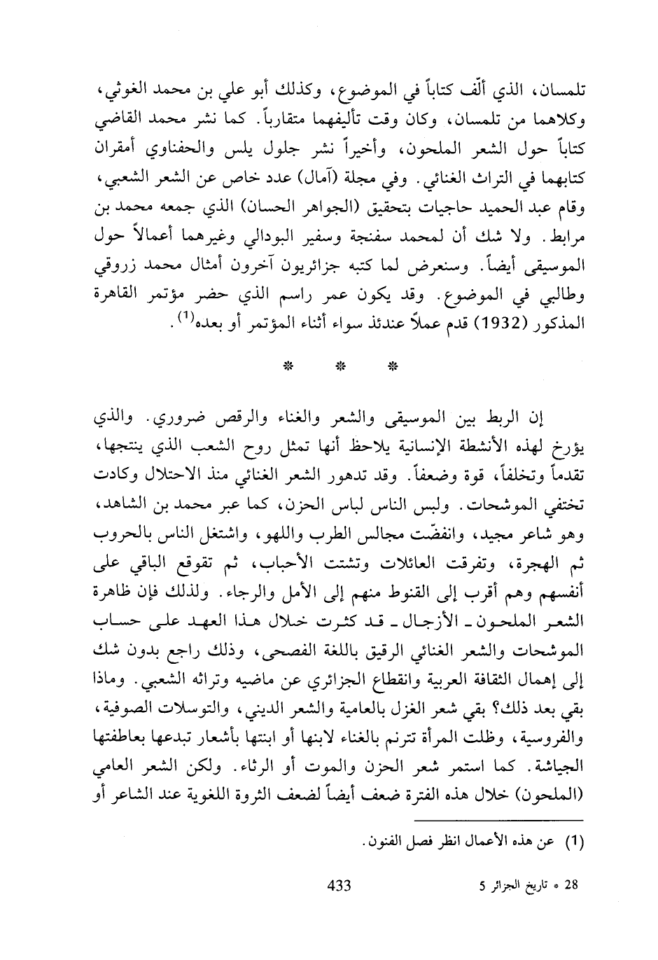 تلمسان، الذي ألف كتابا في الموضوع، وكذلك أبو علي بن محمد الغوثي، وكلاهما من تلمسان، وكان وقت تأليفهما متقاربا. كما نشر محمد القاضي كتابا حول الشعر الملحون، وأخيرا نشر جلول يلس والحفناوي أمقران كتابهما في التراث الغنائي. وفي مجلة (آمال) عدد خاص عن الشعر الشعبي، وقام عبد الحميد حاجيات بتحقيق (الجواهر الحسان) الذي جمعه محمد بن مرابط. ولا شك أن لمحمد سفنجة وسفير البودالي وغيرهما أعمالا حول الموسيقى أيضا. وسنعرض لما كتبه جزائريون آخرون أمثال محمد زروقي وطالبي في الموضوع. وقد يكون عمر راسم الذي حضر مؤتمر القاهرة المذكور (1932) قدم عملا عندئذ سواء أثناء المؤتمر أو بعده (¬1).