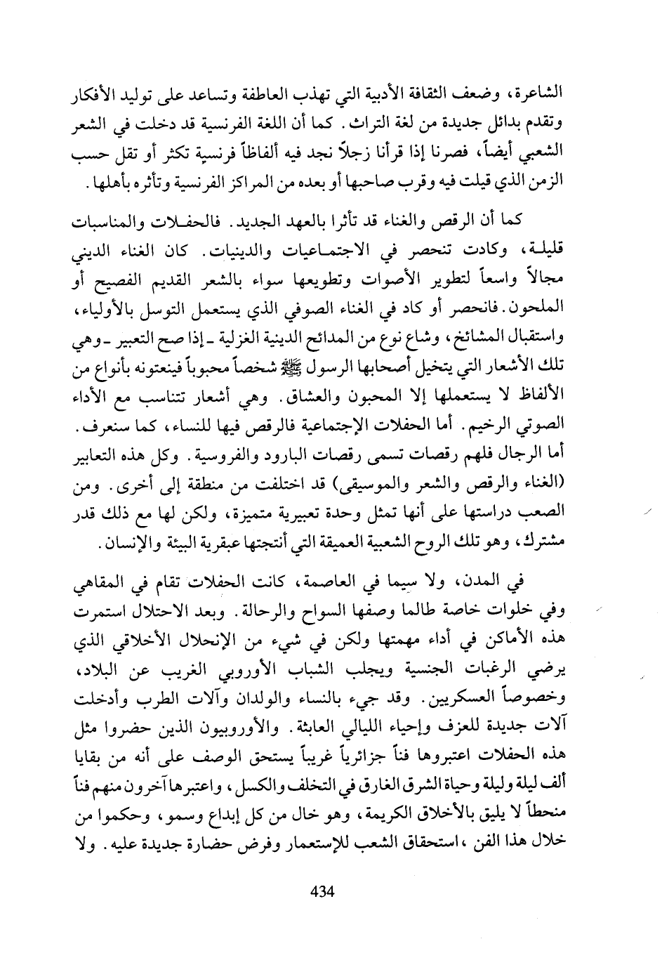 كما أن الرقص والغناء قد تأثرا بالعهد الجديد. فالحفلات والمناسبات قليلة، وكادت تنحصر في الاجتماعيات والدينيات. كان الغناء الديني مجالا واسعا لتطوير الأصوات وتطويعها سواء بالشعر القديم الفصيح أو الملحون. فانحصر أو كاد في الغناء الصوفي الذي يستعمل التوسل بالأولياء، واستقبال المشائخ، وشاع نوع من المدائح الدينية الغزلية - إذا صح التعبير - وهي تلك الأشعار التي يتخيل أصحابها الرسول شخصا محبوبا فينعتونه بأنواع من الألفاظ لا يستعملها إلا المحبون والعشاق. وهي أشعار تتناسب مع الأداء الصوتي الرخيم. أما الحفلات الإجتماعية فالرقص فيها للنساء، كما سنعرف. أما الرجال فلهم رقصات تسمى رقصات البارود والفروسية. وكل هذه التعابير (الغناء والرقص والشعر والموسيقى) قد اختلفت من منطقة إلى أخرى. ومن الصعب دراستها على أنها تمثل وحدة تعبيرية متميزة، ولكن لها مع ذلك قدر مشترك، وهو تلك الروح الشعبية العميقة التي أنتجتها عبقرية البيئة والإنسان.