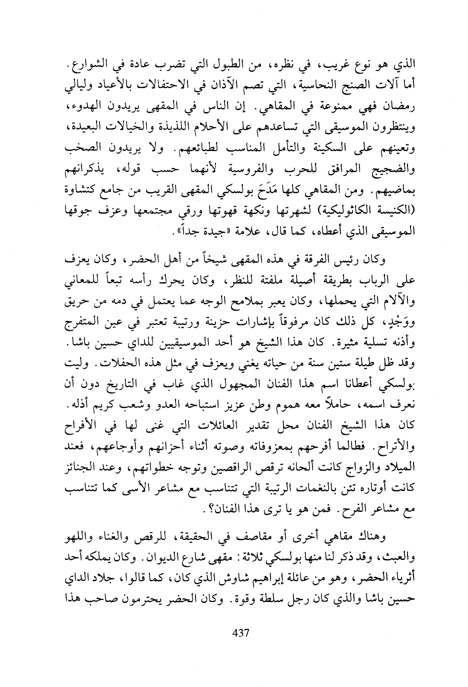 الذي هو نوع غريب، في نظره، من الطبول التي تضرب عادة في الشوارع. أما آلات الصنج النحاسية، التي تصم الآذان في الاحتفالات بالأعياد وليالي رمضان فهي ممنوعة في المقاهي. إن الناس في المقهى يريدون الهدوء، وينتظرون الموسيقى التي تساعدهم على الأحلام اللذيذة والخيالات البعيدة، وتعينهم على السكينة والتأمل المناسب لطبائعهم. ولا يريدون الصخب والضجيج المرافق للحرب والفروسية لأنهما حسب قوله، يذكرانهم بماضيهم. ومن المقاهي كلها مدح بولسكي المقهى القريب من جامع كتشاوة (الكنيسة الكاثوليكية) لشهرتها ونكهة قهوتها ورقي مجتمعها وعزف جوقها الموسيقى الذي أعطاه، كما قال، علامة (جيدة جدا).